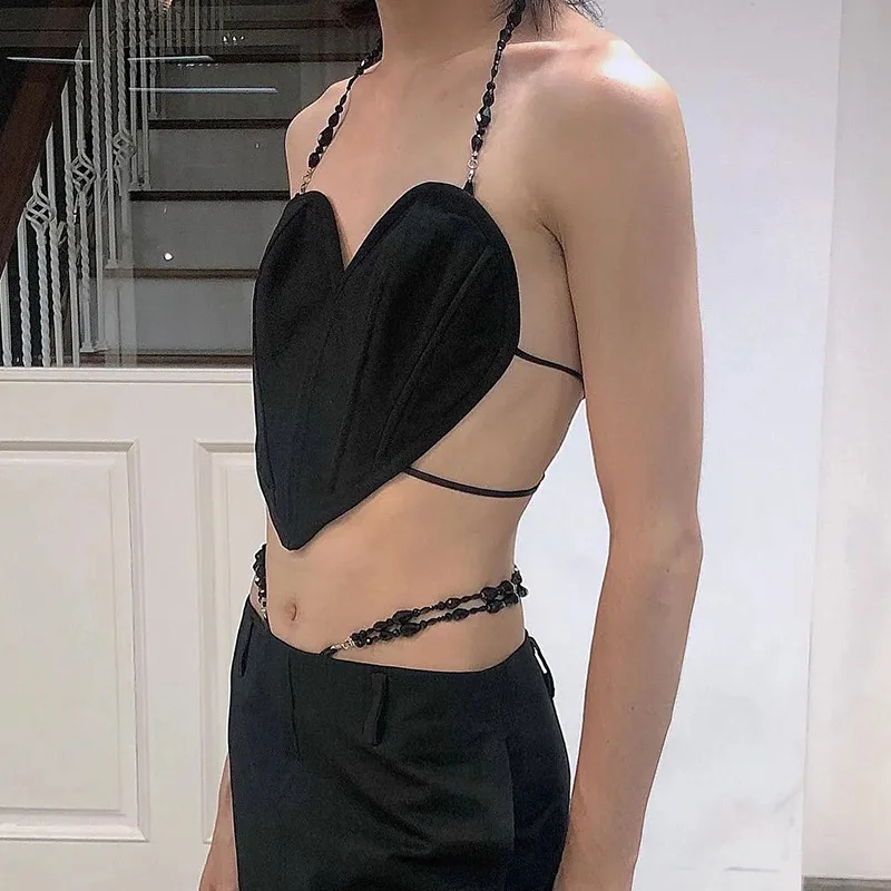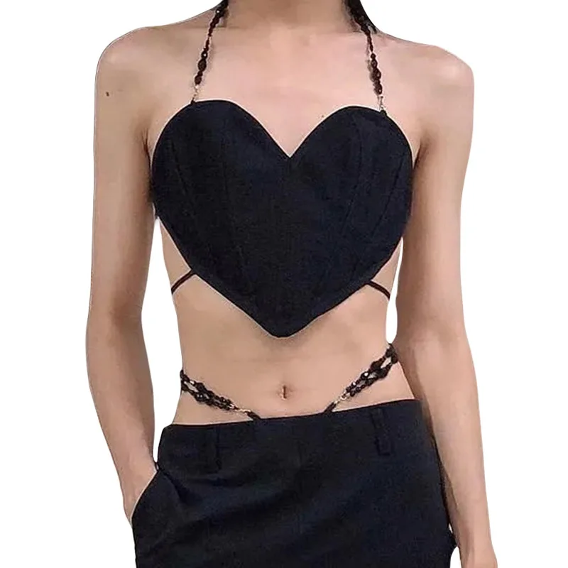 Sexy Women's High Street Casual Tube Top Unique Design Halter Lace up Solid Cleavage Backless Heart-Shaped Vest