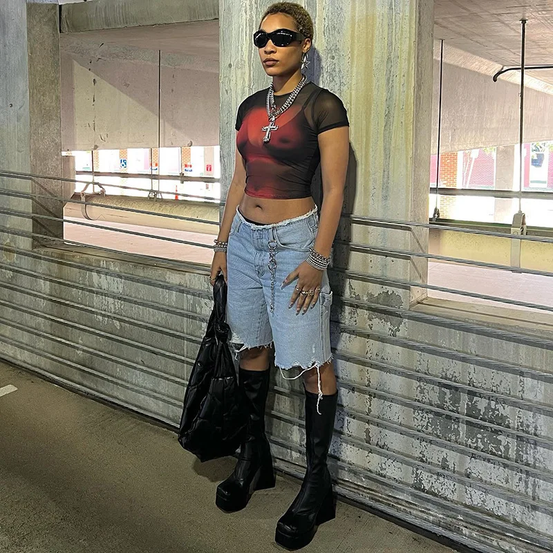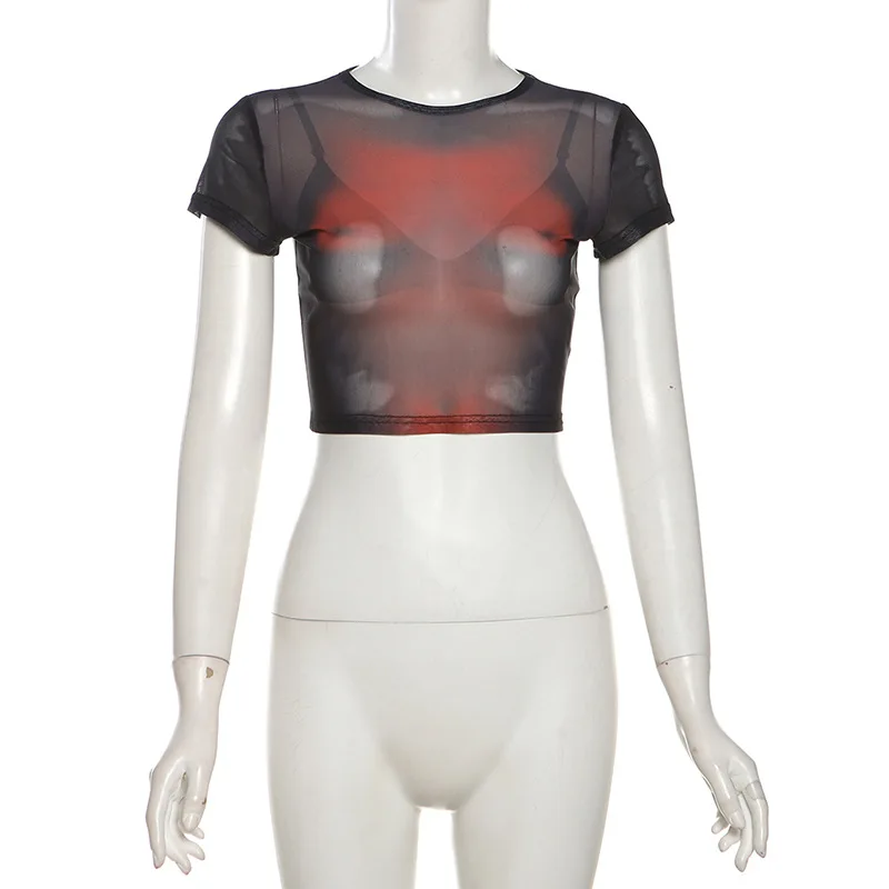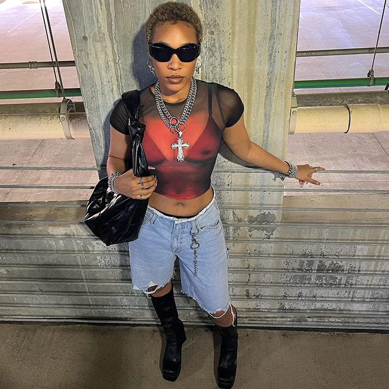 K23L38989 Summer Clothing Printed T-shirts Short Sleeve Mesh Women Tops Stretchy Shirts for Women