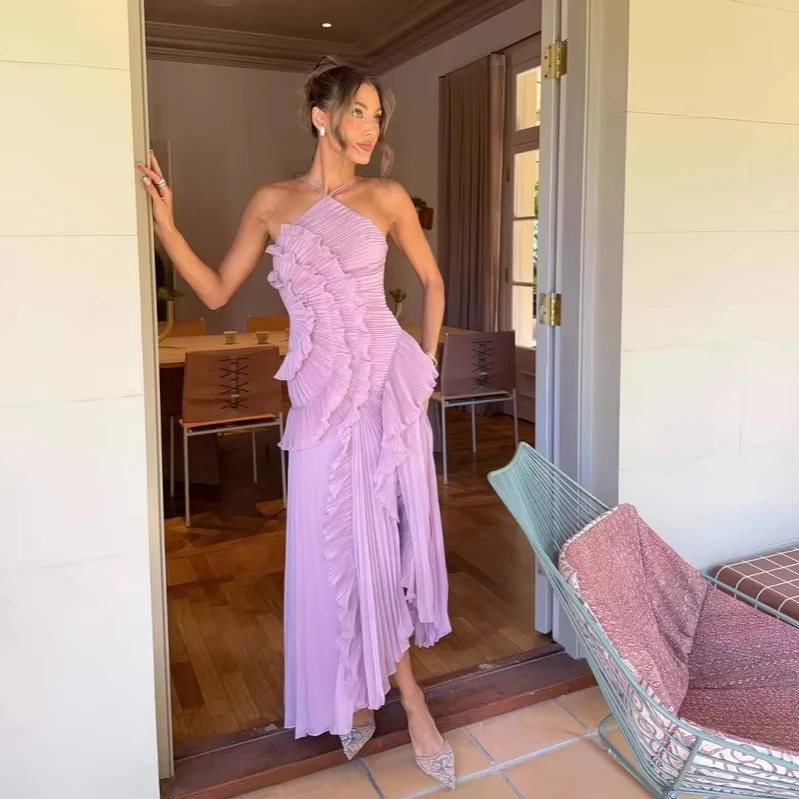 High Quality 2025 Summer Fashion New Arrival Best-selling Chiffon Purple Casual Dress Ruffled Slim Halter Elegant Long Dress