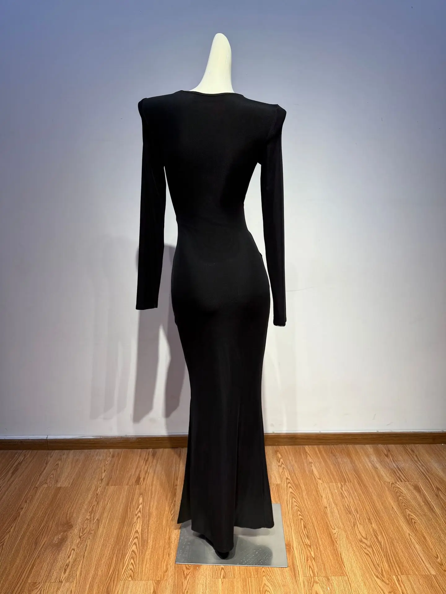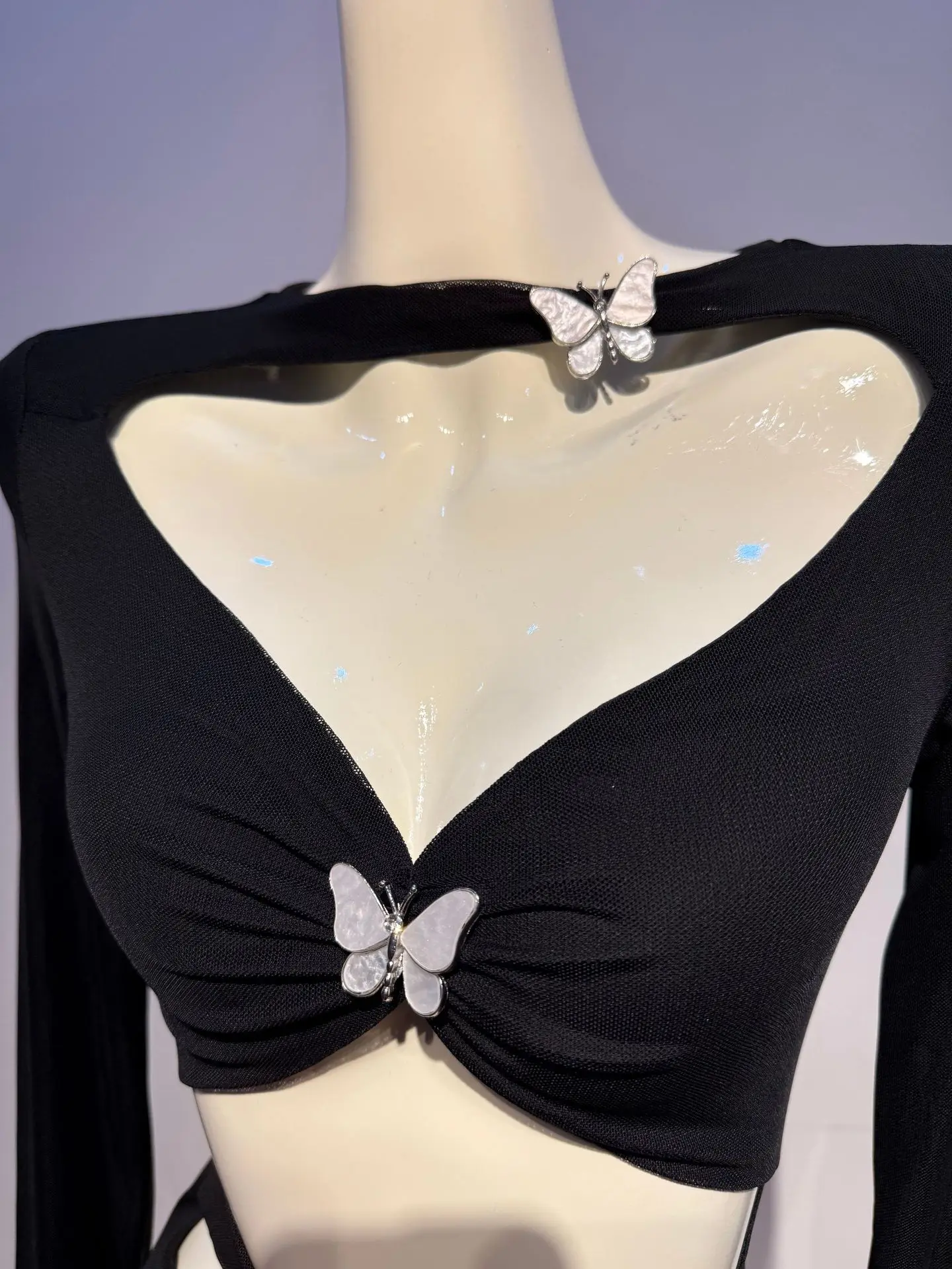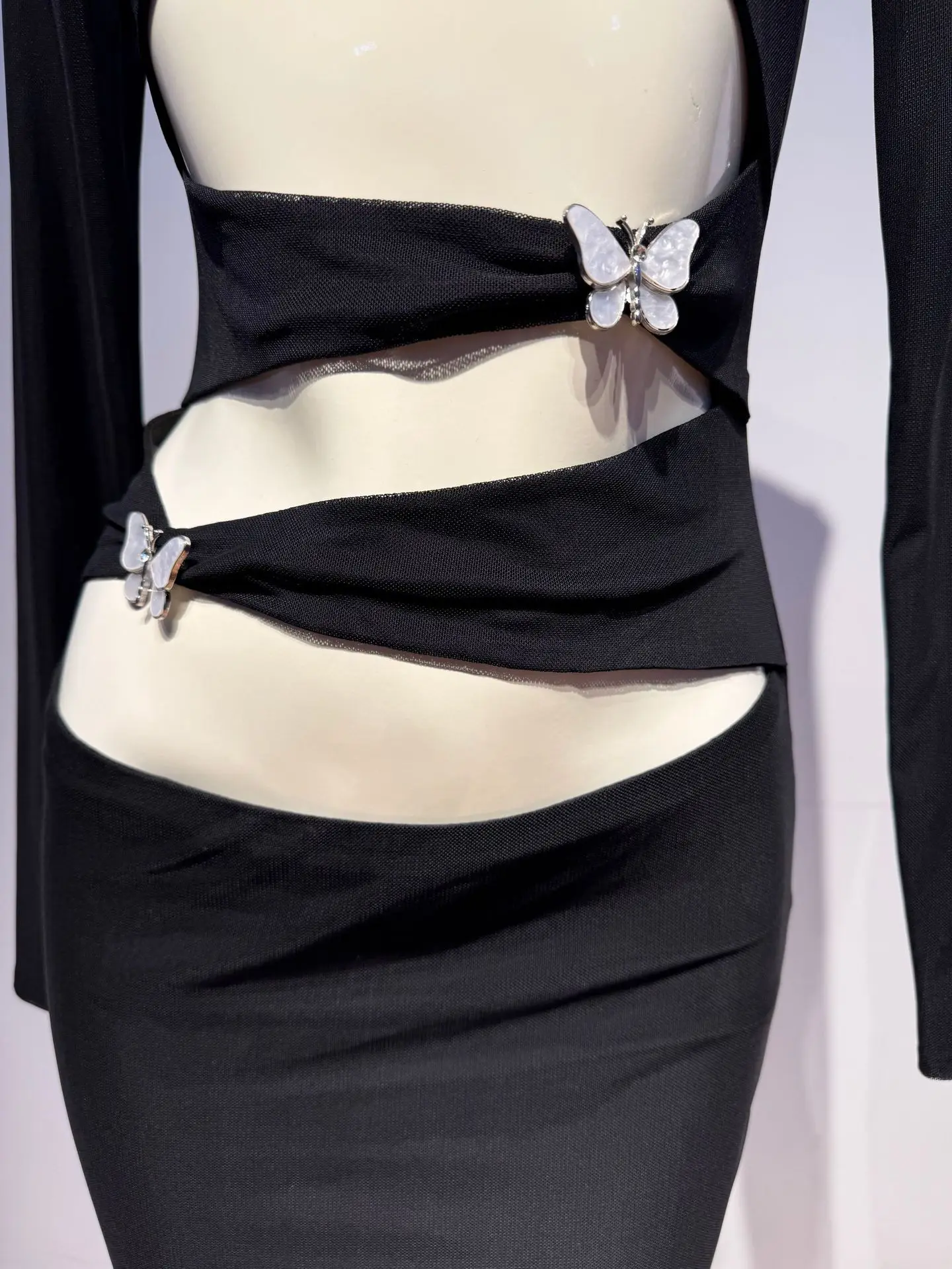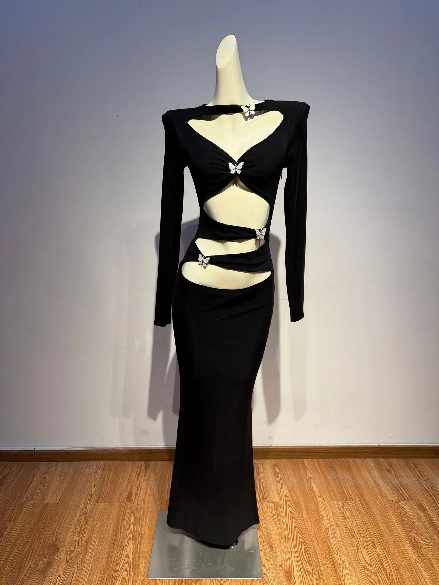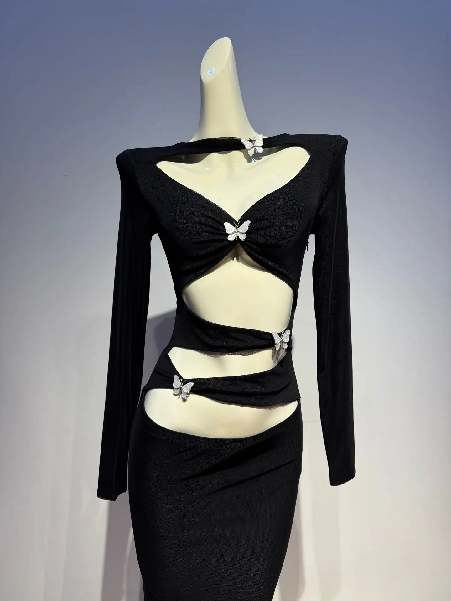 Spicy Girl Style Hollow Out Design Sense Crop Top Ruched Bow Dress Women Long Sleeve Slim Fit Bodycon Long Dress
