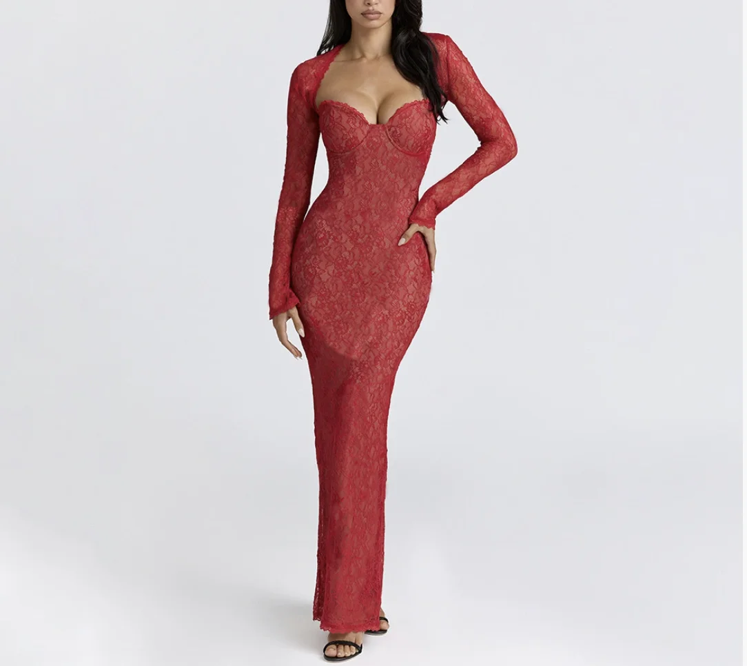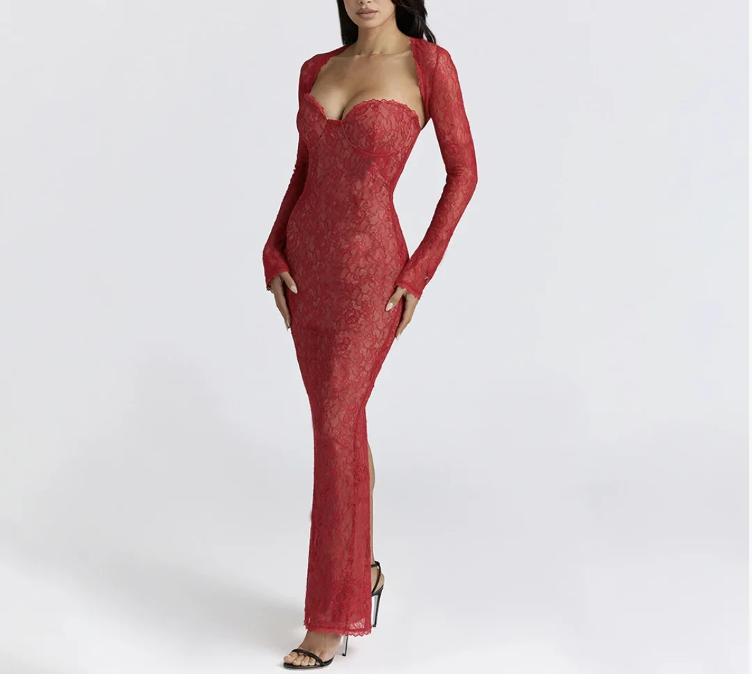 Autumn Winter New Lace See-through Shawl Long Sleeve Top Sexy Tight Tube Top Mermaid Skirt Set