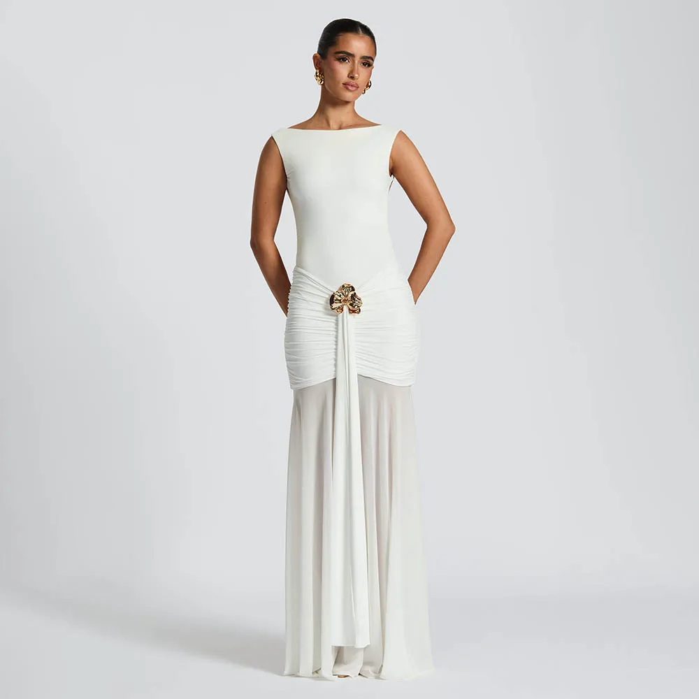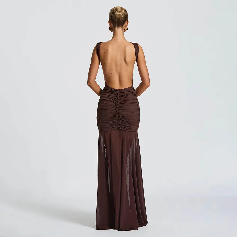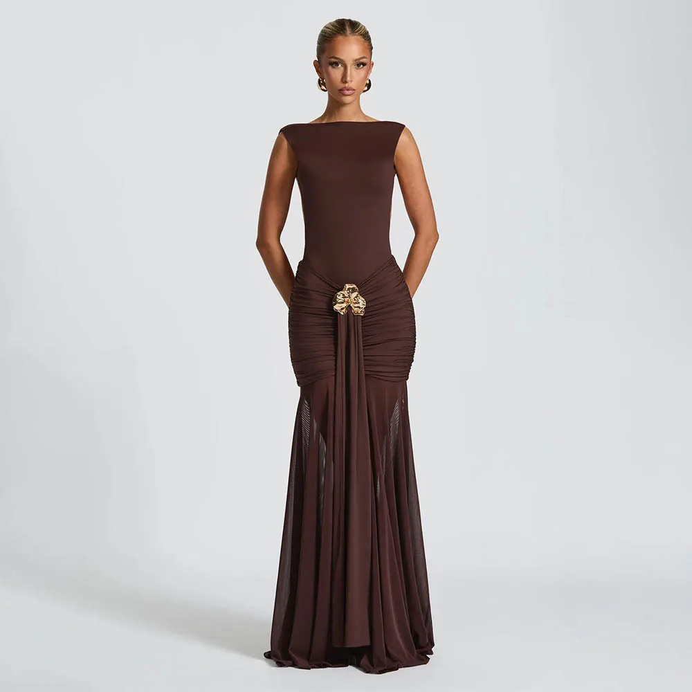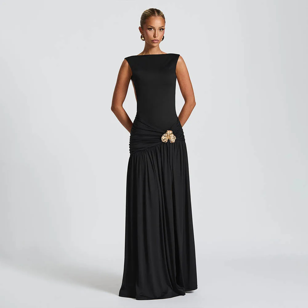 2025 New Summer Women's Clothing Round Neck Backless Dress Fashionable Sleeveless Pleated Slit Slim Dress