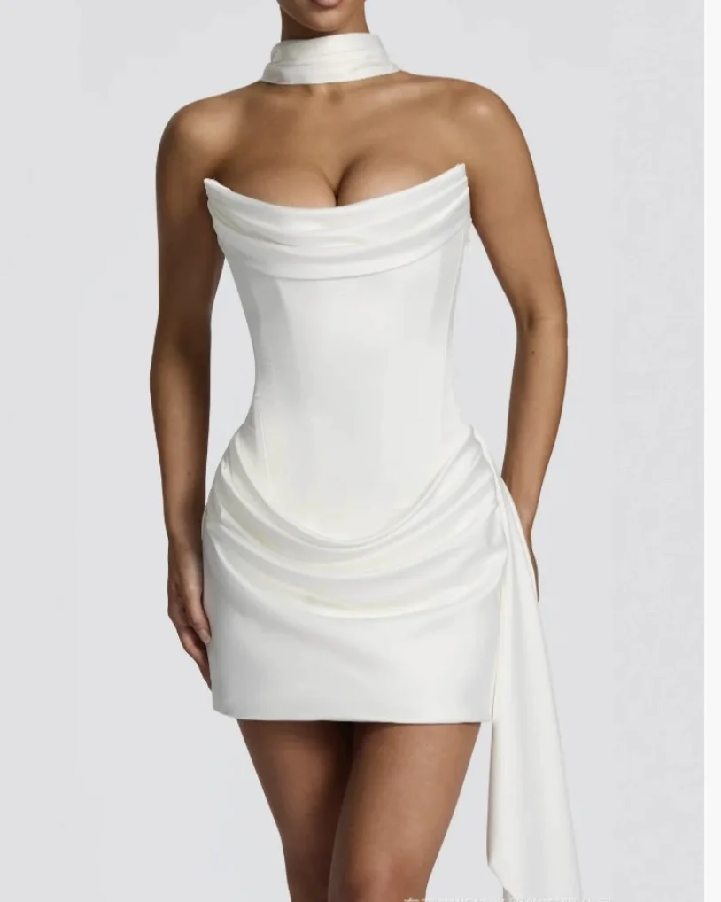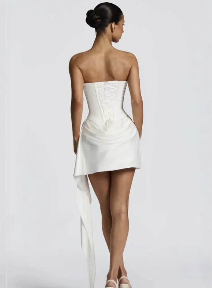 SDM191 Elegant White Short Satin Tube Top Dress with Boning Sleeveless Wholesale New Arrival