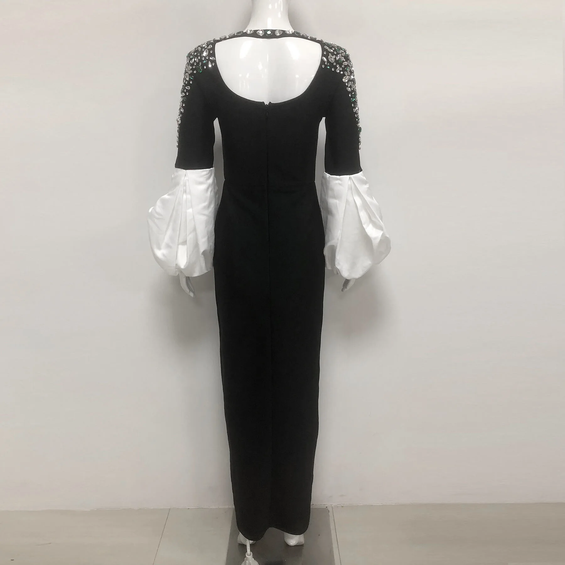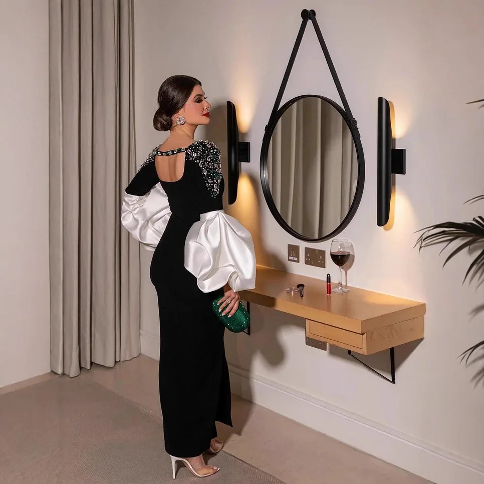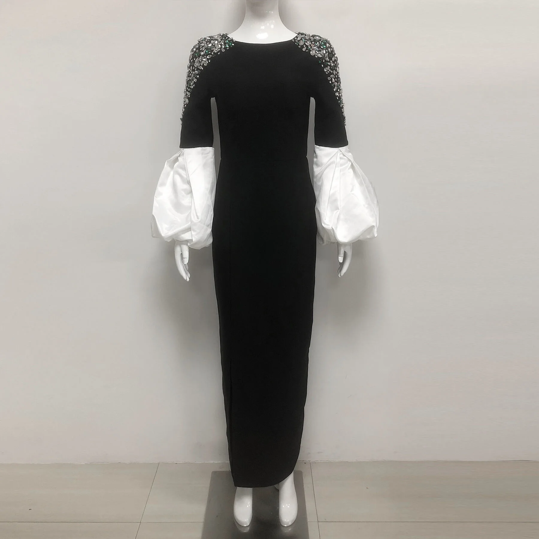 Elegant Black Evening Formal Dresses Beaded Rhinestone Shoulders Puff Sleeves Maxi Long Design for Party Club Cocktail Events