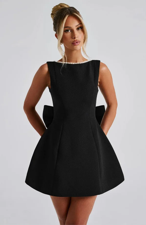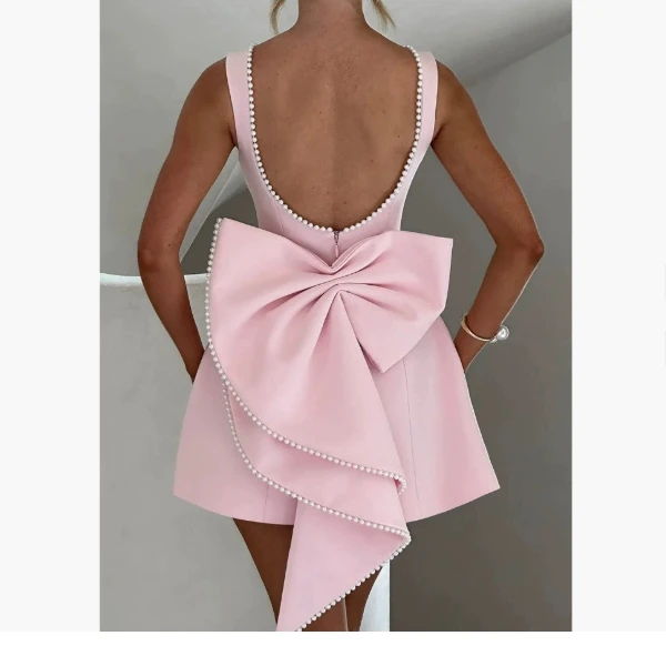New Women's Clothing Women Casual Dresses Temperament Waist Pearl Bow Backless a Line Ladies Mini Dress