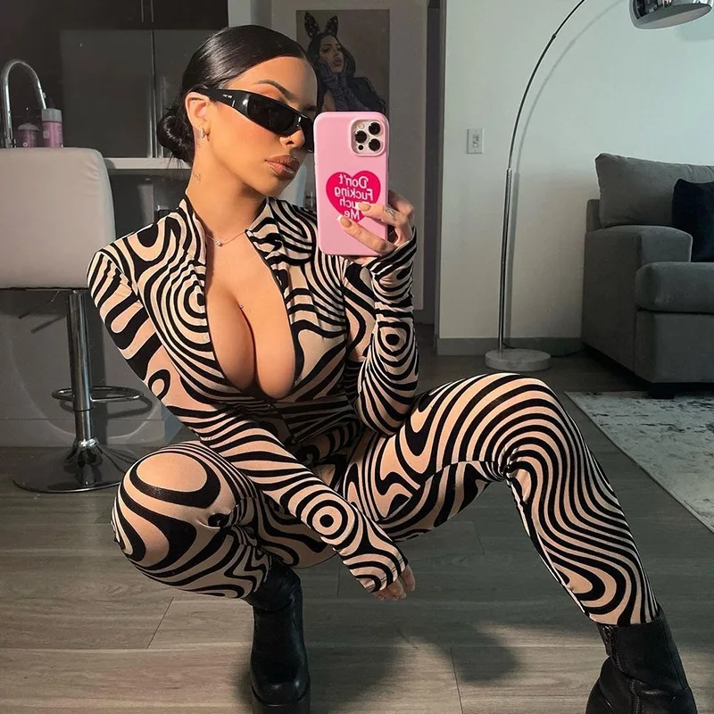 Casual Fashion Party New Women's Bodycon Long Sleeve V-Neck Printed Retro Tight Bodycon Jumpsuit Cami Jumpsuit