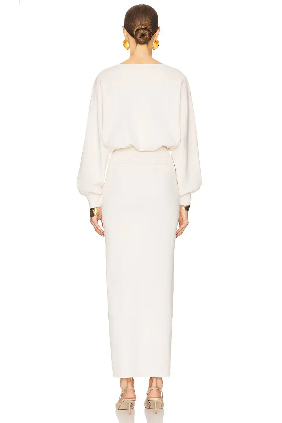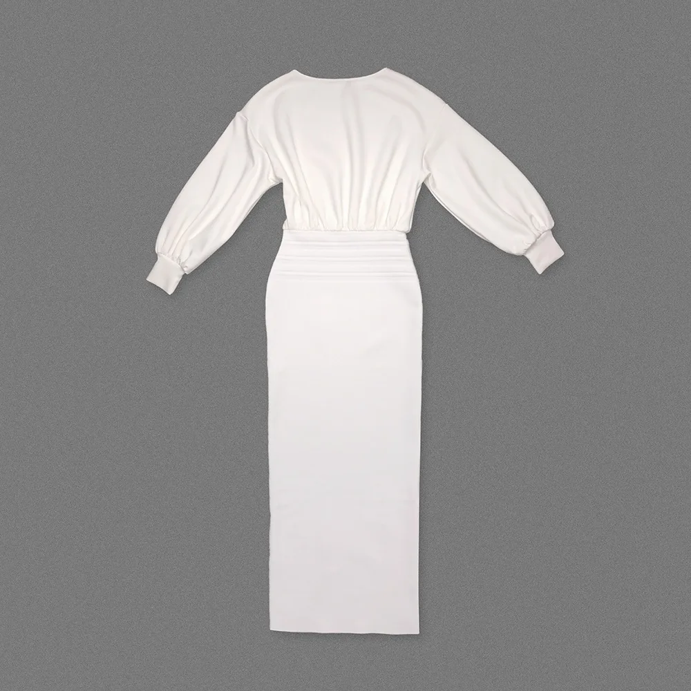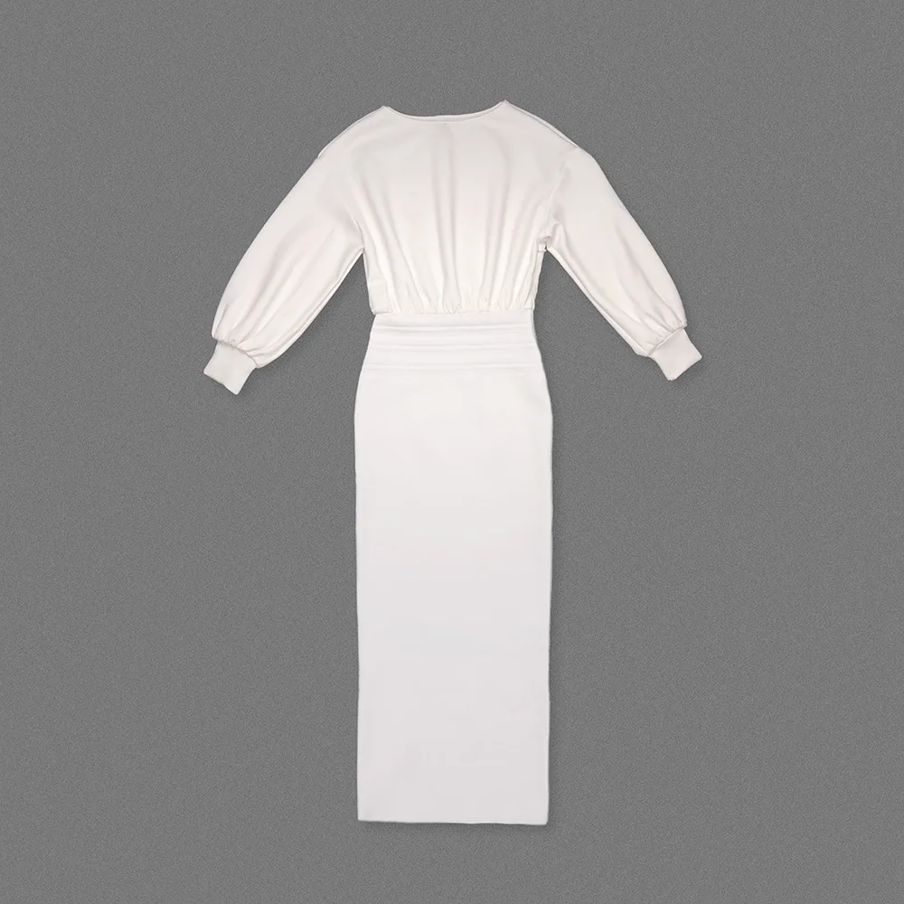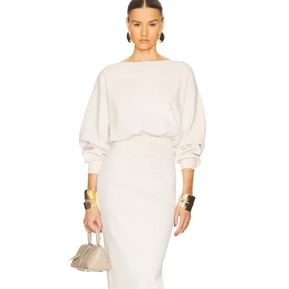 Elegant Lady Ship Collar White Long Sleeve Midi Dress Elastic Waistband Bodycon Chic Gown Comfort Party Dress