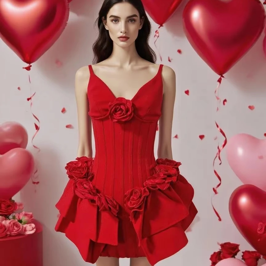2025 Christmas Strap V-neck Bandage Floral Dress Short Skirt Wrinkled Patchwork Small Hem Evening Dress