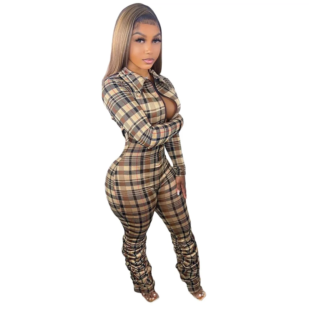 New Autumn and Winter Plaid Printed Lapel Slim Pleated Zipper Jumpsuit
