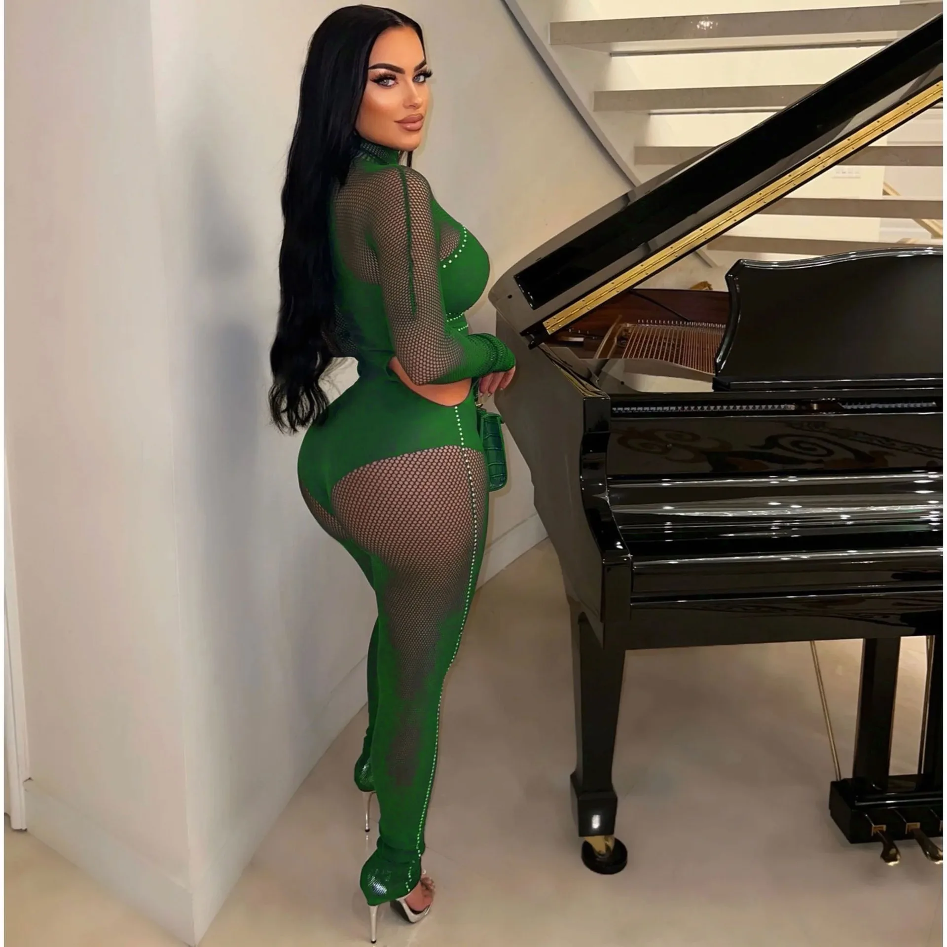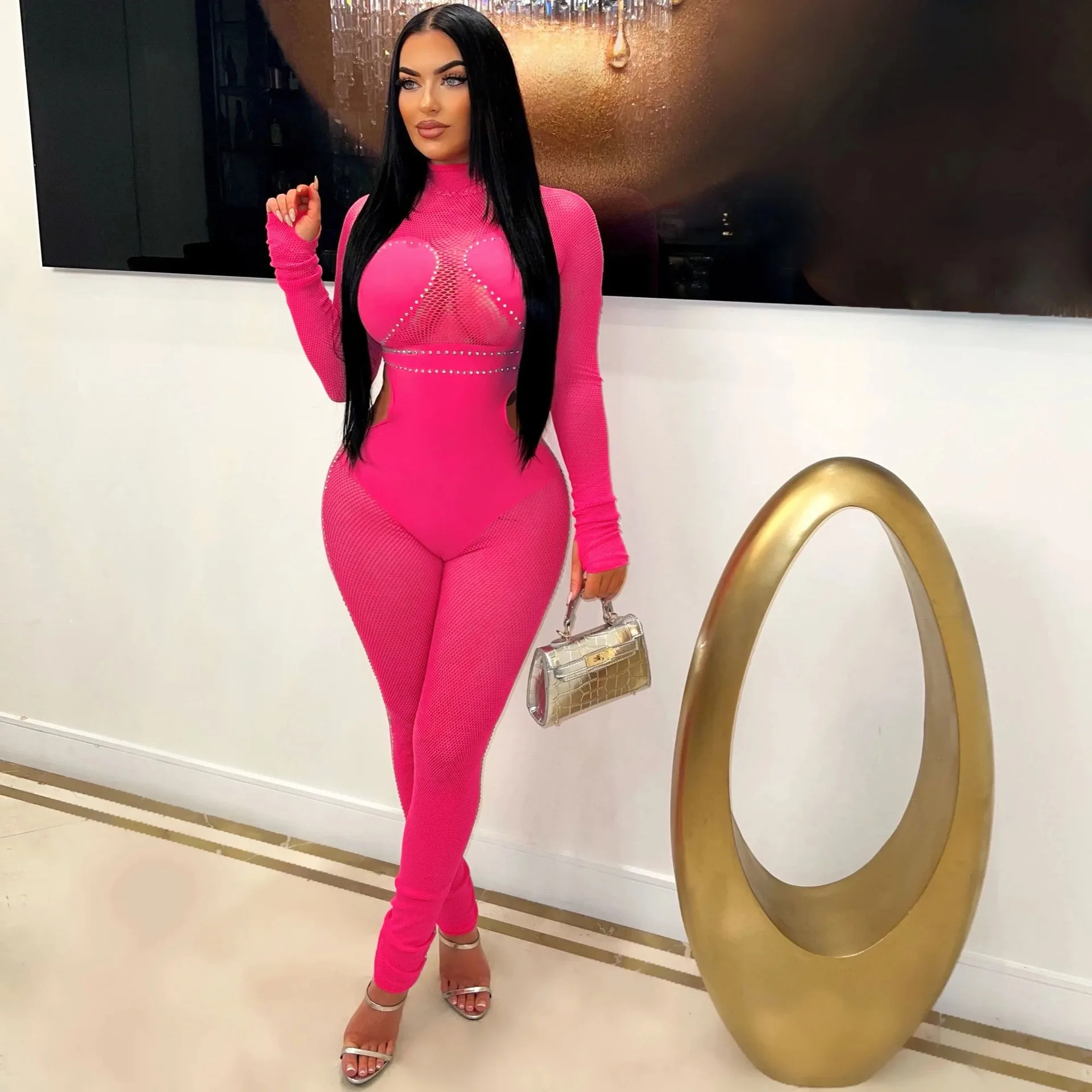 Hot sale Spring and Summer New Nightclub Style Sexy Mesh Long Sleeve Jumpsuit