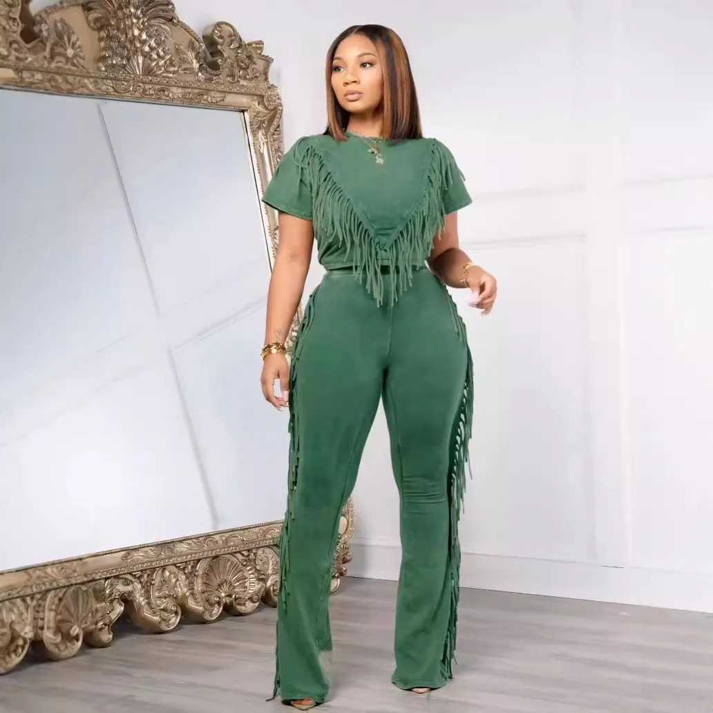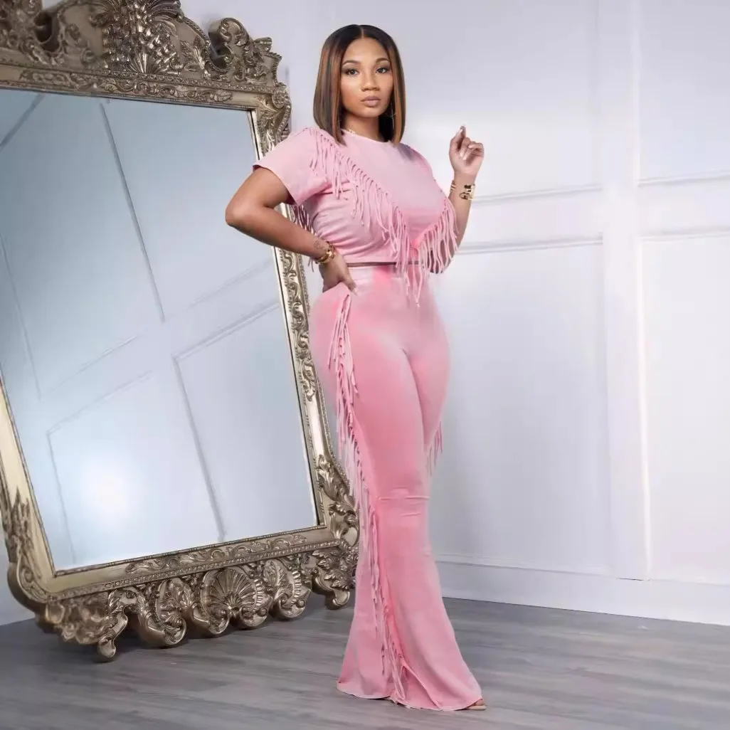Hot sale Summer New Women's Elastic Tassel Decoration Casual and Comfortable Two Piece Set