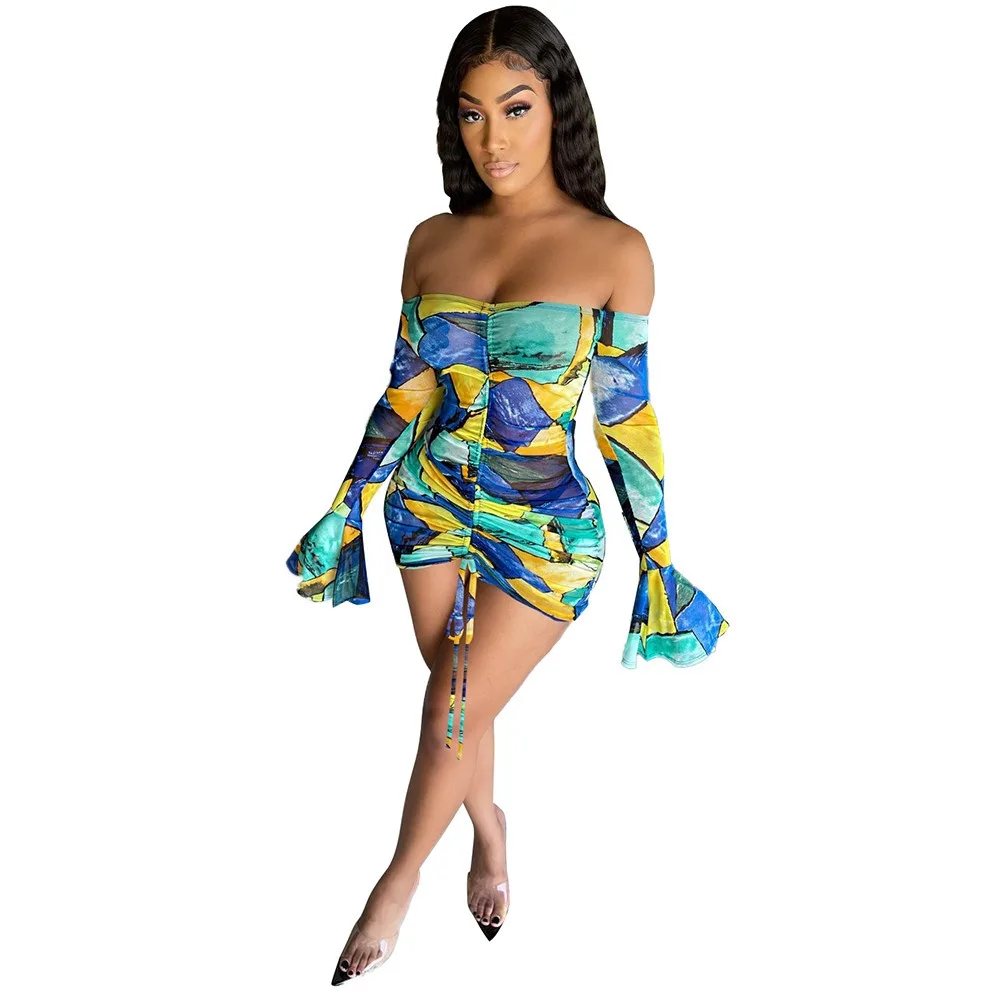 Spring New Women's One Shoulder Sexy Printed Strap Pleated Dress