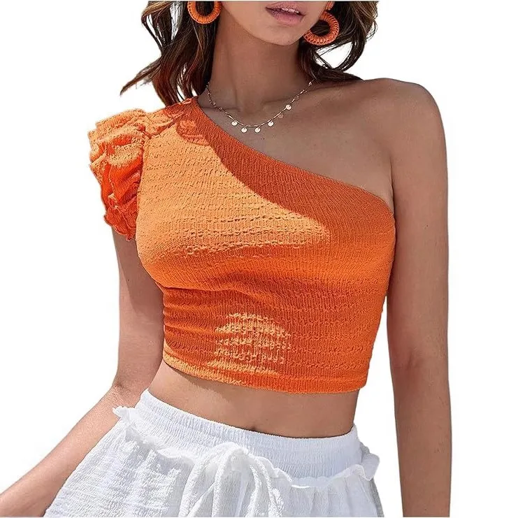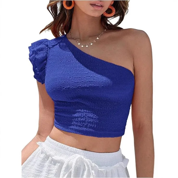 2025 Summer Women's One Shoulder Asymmetric Neck Fashion Solid Color Ruffle Edged Open Umbilical Short Top