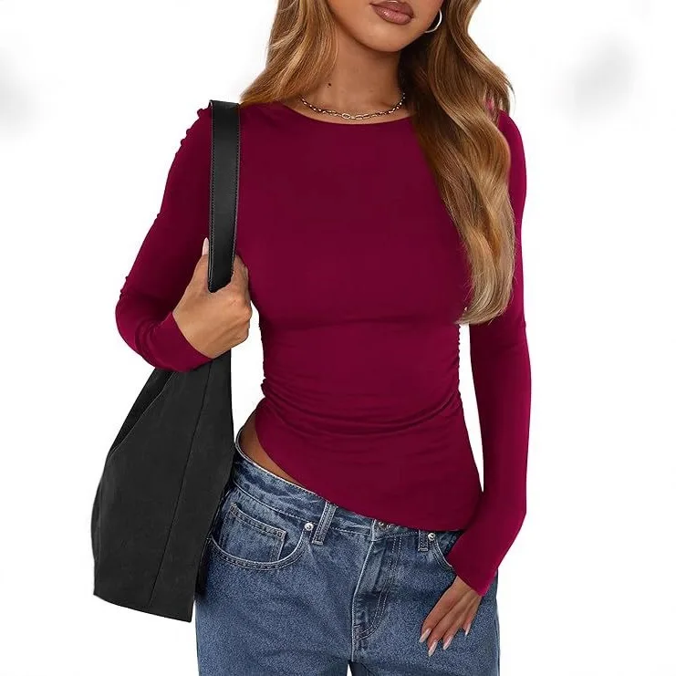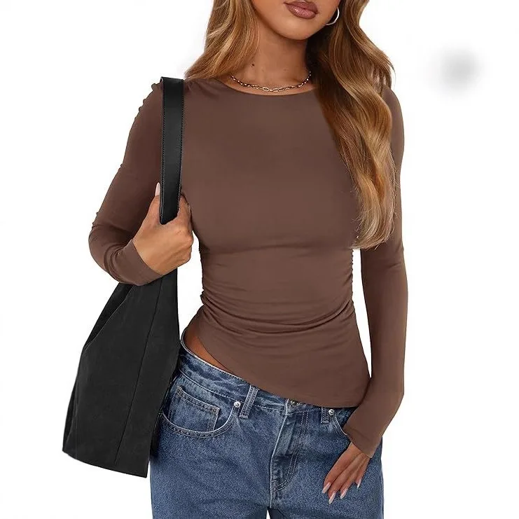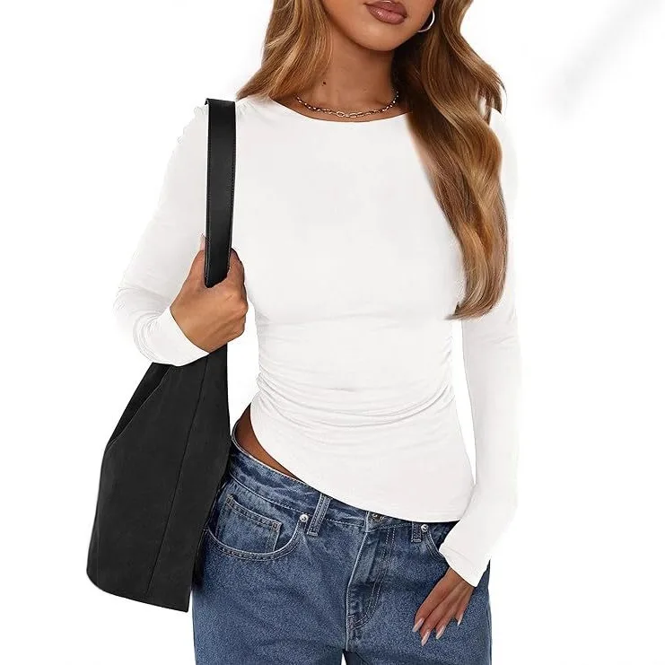 2025 Autumn Women's Long Sleeved Fashionable Round Neck Slim Asymmetric T-shirt