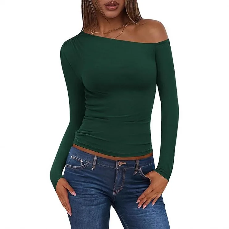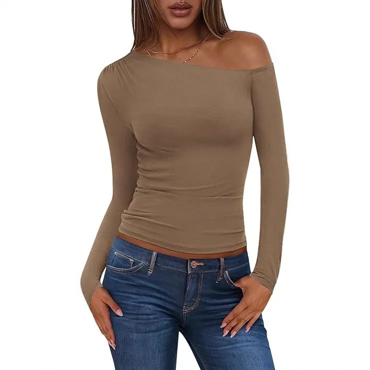 2025 Autumn Women's Sexy Off Shoulder Long Sleeve Slant Neck Fashion Casual T-shirt