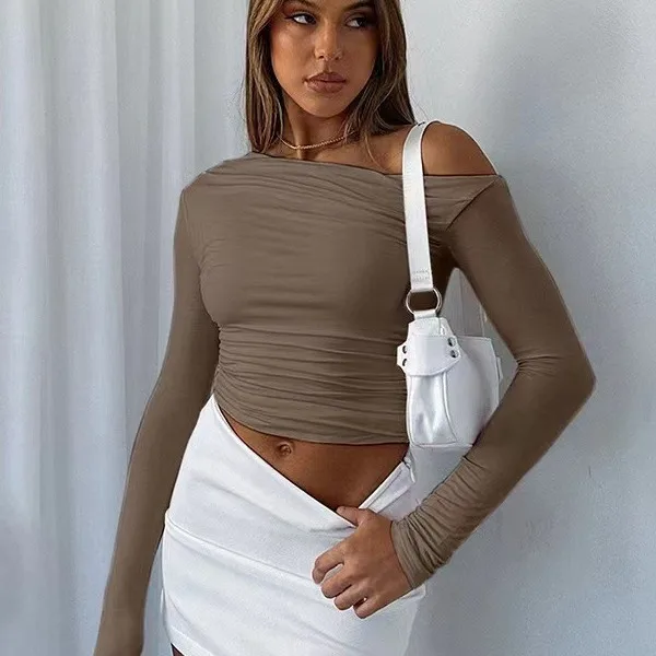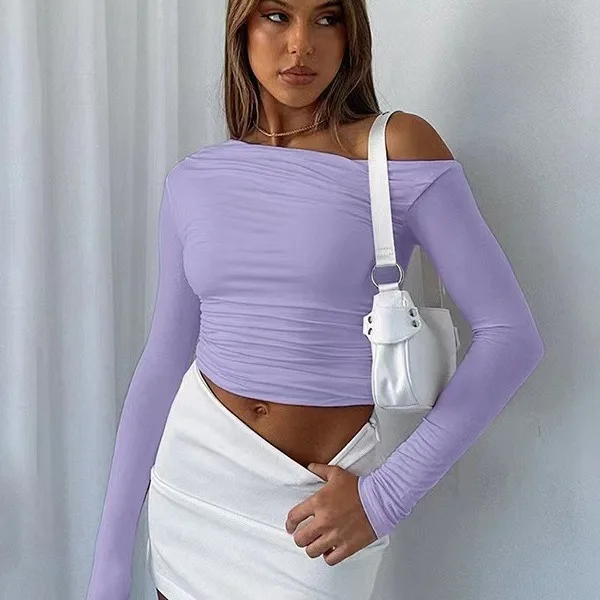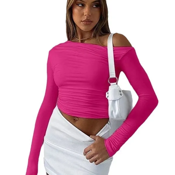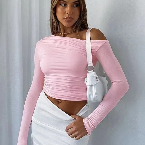 Summer Women's Slant Shoulder Asymmetric Solid Color Open Umbilical Long Sleeve Sexy Slimming Style T-shirt