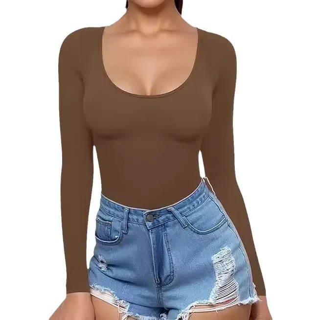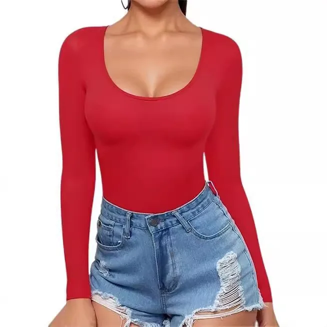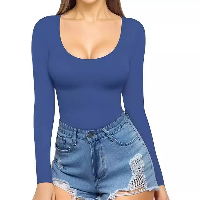 2025 Summer Women's Low Round Neck Long Sleeve Sexy Slimming Fashion Casual T-shirt