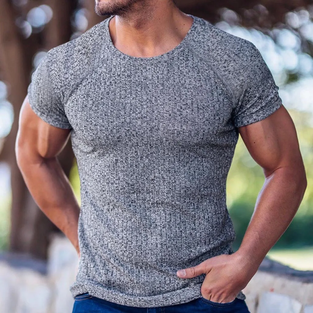 Summer Men's Sports and Leisure Vertical Elastic Vertical Round Neck Short Sleeved T-shirt