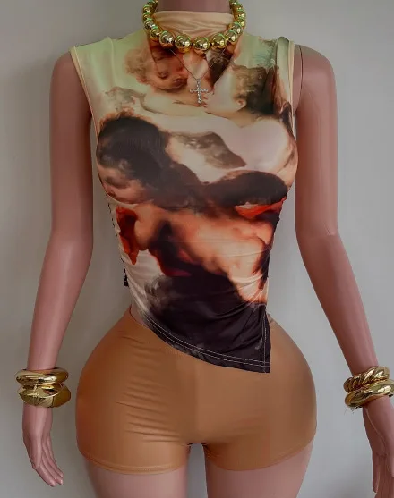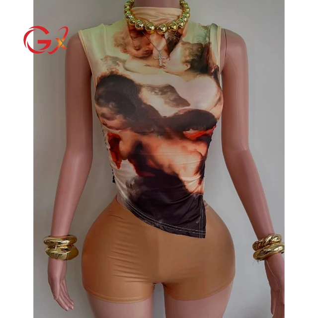 GX0335 Wholesale Women Boutique Casual Street Wear O-neck Sleeveless Irregular Printed Top and Shorts 2 Piece Set