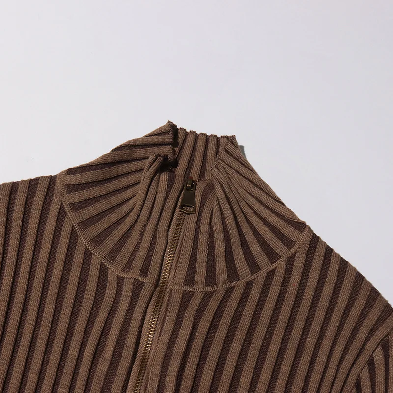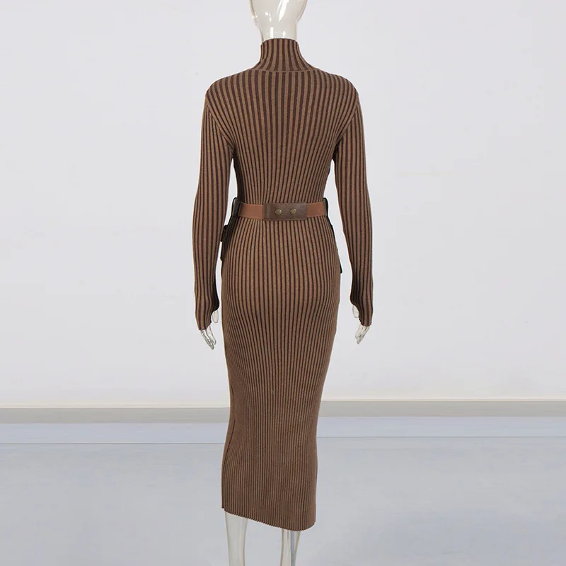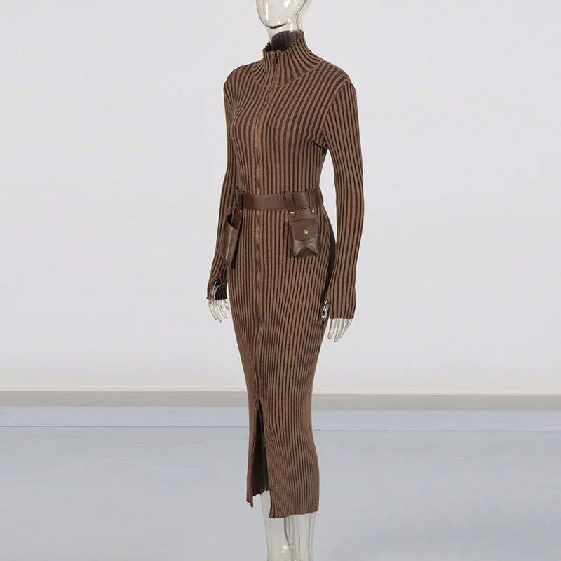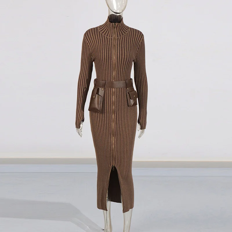 GX14042 Autumn Winter High Quality Women's Long Sleeve Turtleneck Zipper Maxi Dress Elegant With Belt Knitted Unique Dresses