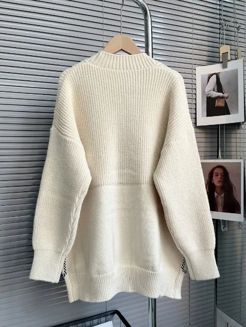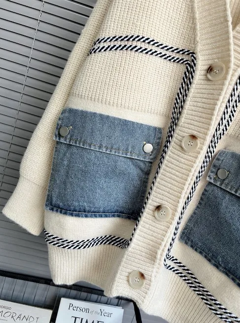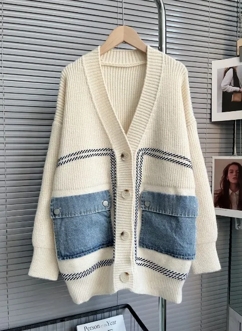 GX1637 Female Streetwear Fashion Casual Knit Sweater Women Denim Patchwork Elegant Unique Long Sleeve V-Neck Cardigan Sweater