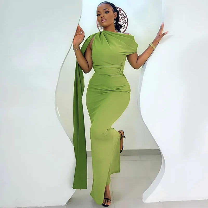 ZYHT 73849 European Wholesale Fashion Casual One Shoulder Ruched Maxi Dress Side Slit Pleated Long Sleeve Dresses for Women