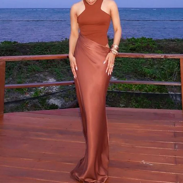 GX933 Fashion Summer Street Wear Clothes Boutique Sleeveless Color Patchwork Satin Long Dresses Evening Party Cut-Out Maxi Dress