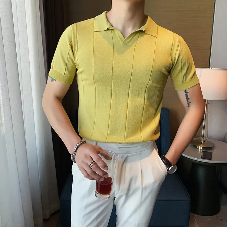 2024 Summer Men's Short Sleeve V-neck Fashion T-shirt Knitted Pullover Short Sleeve for Men