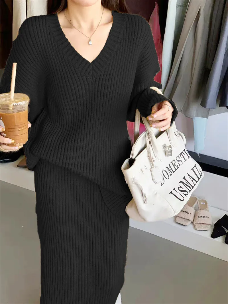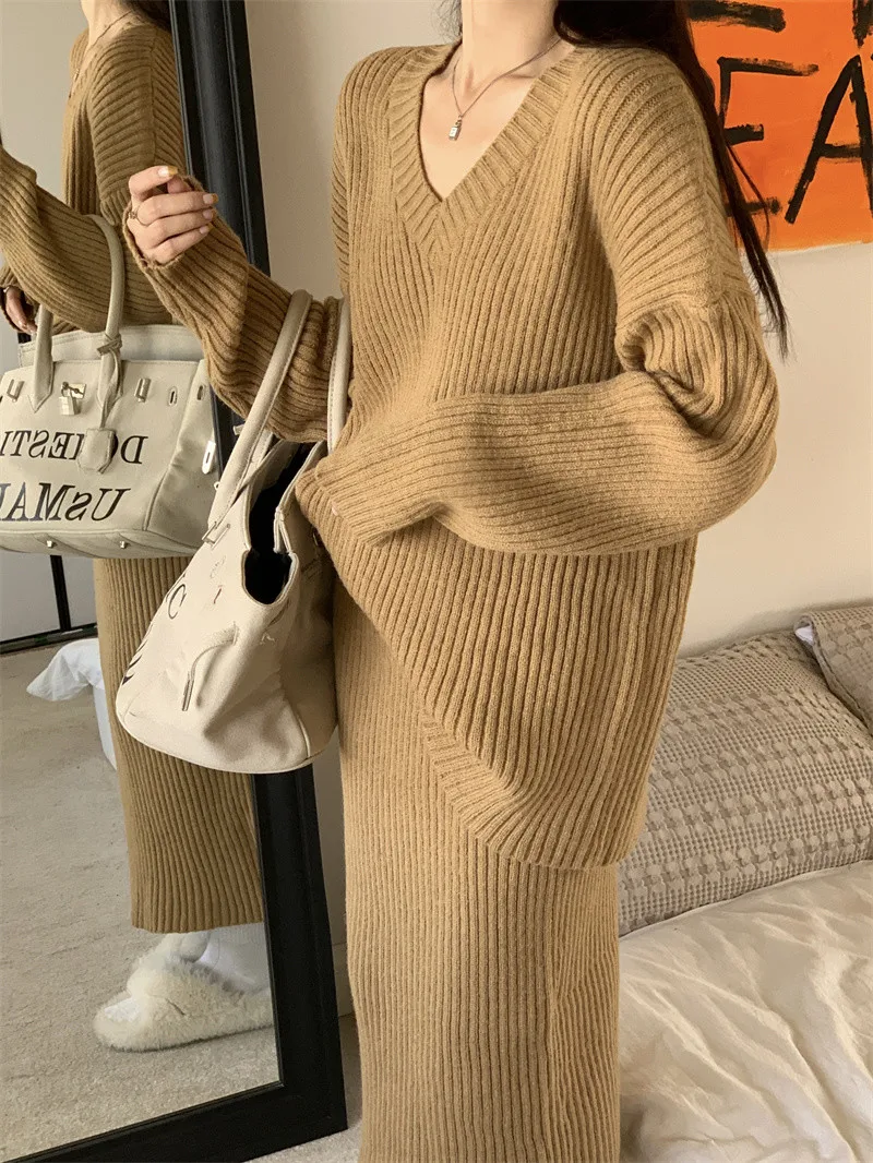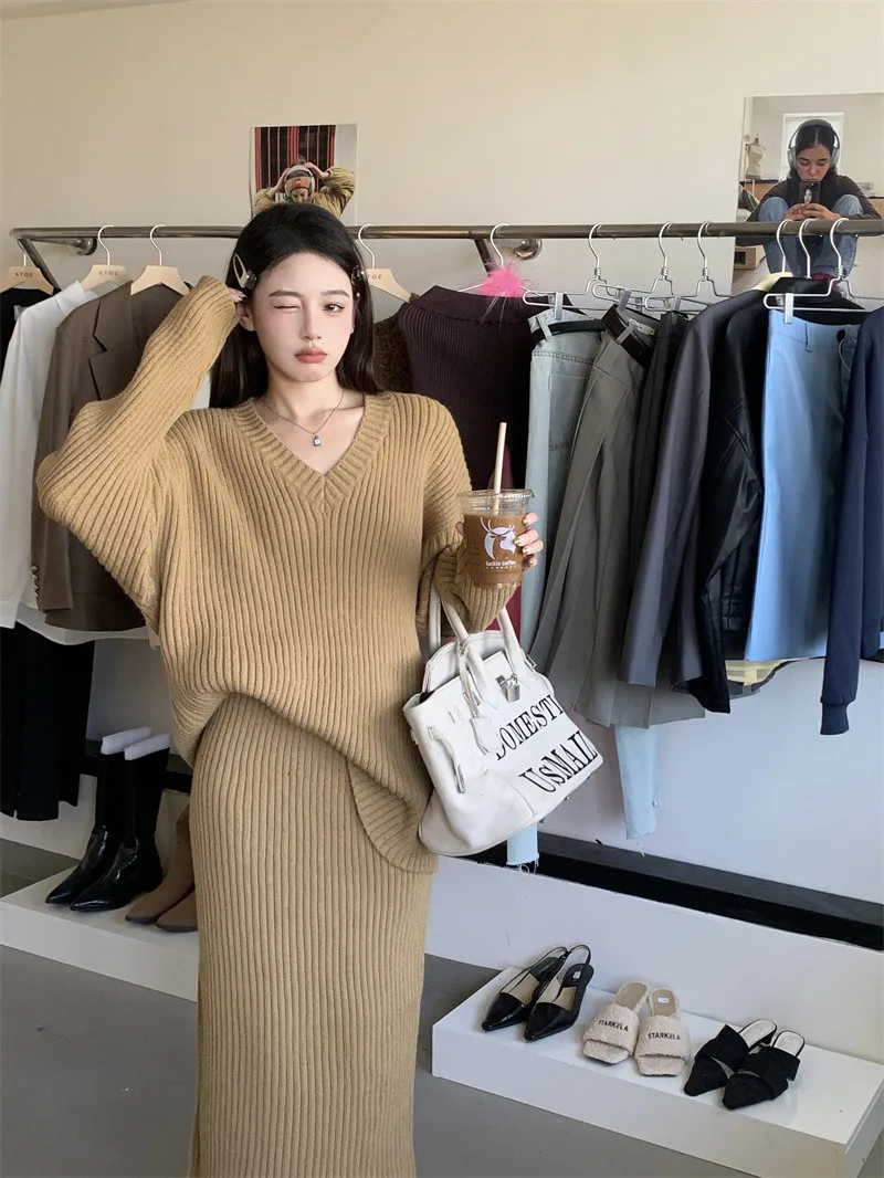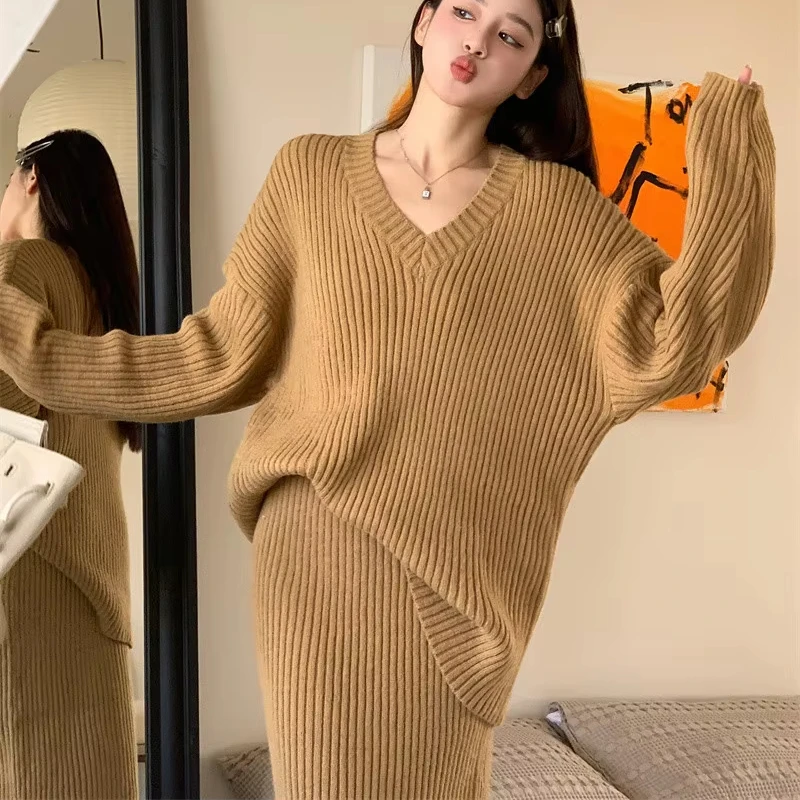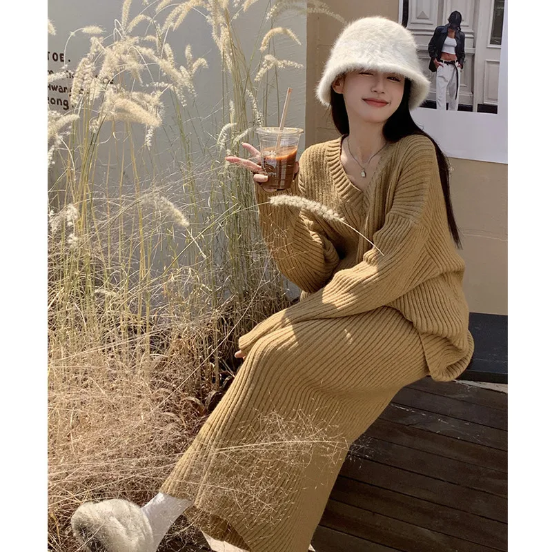 New Autumn and Winter Loose Round Neck Knitted Sweater Slimming Skirt Two-piece Set for Women