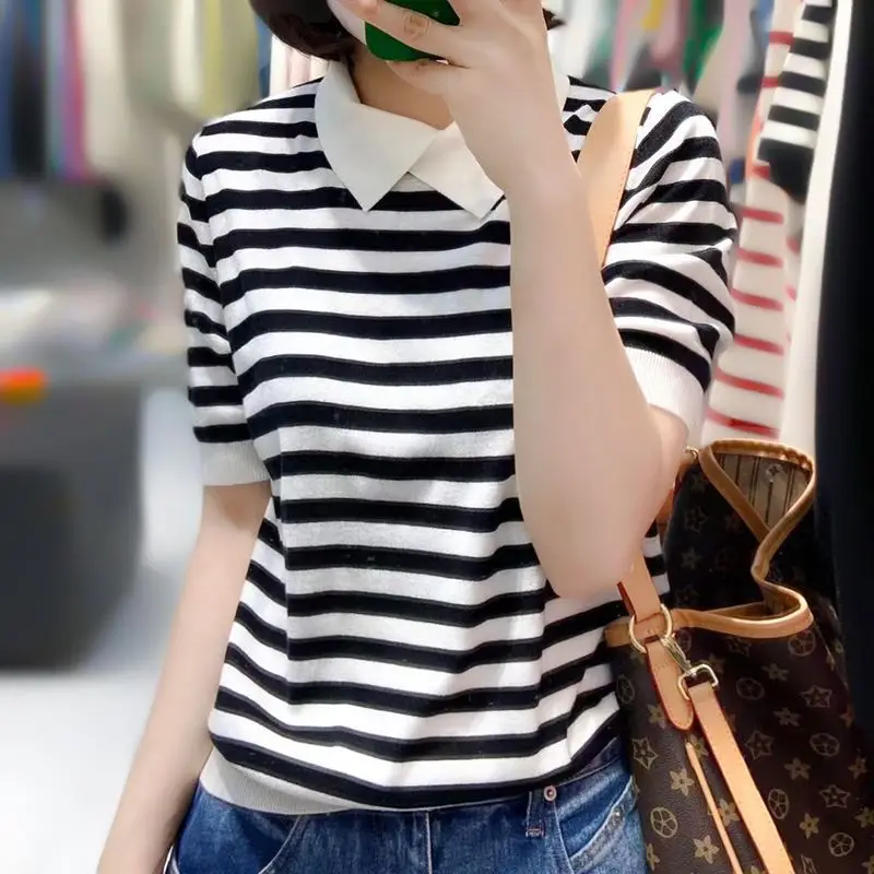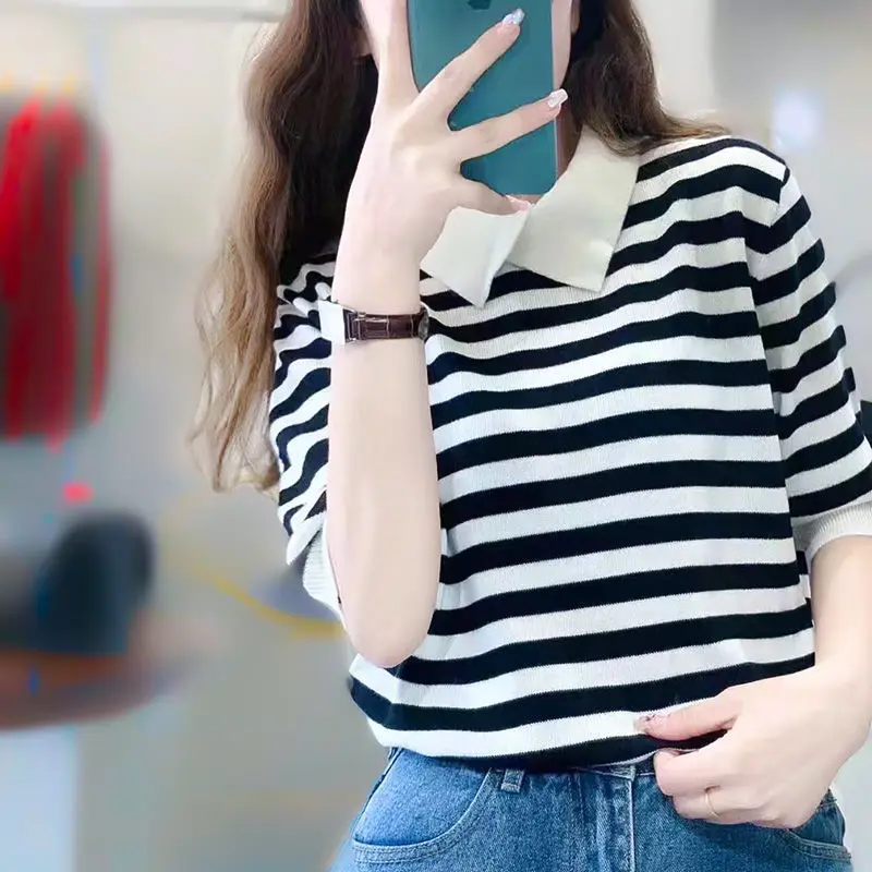 Summer Short Sleeve T-shirt Female Design College Style Short Sweater Top Stripe Women's Top Knit