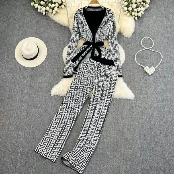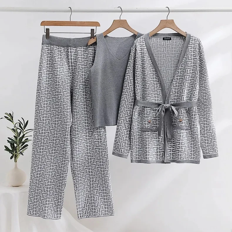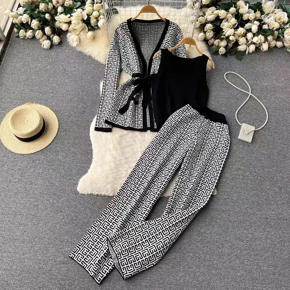 Spring Knitted Suit Casual Fashion Cross Color Blocking Slimming Cardigan Vest Trousers Three-piece Set Female