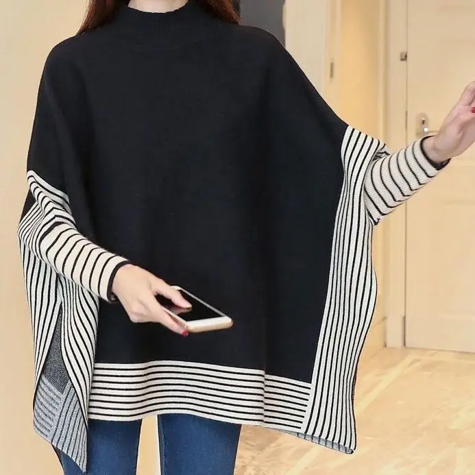 Preppy Style Women's Fashionable Batwing Sleeve Stripe Knit Poncho for Winter