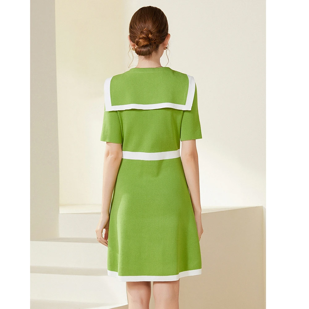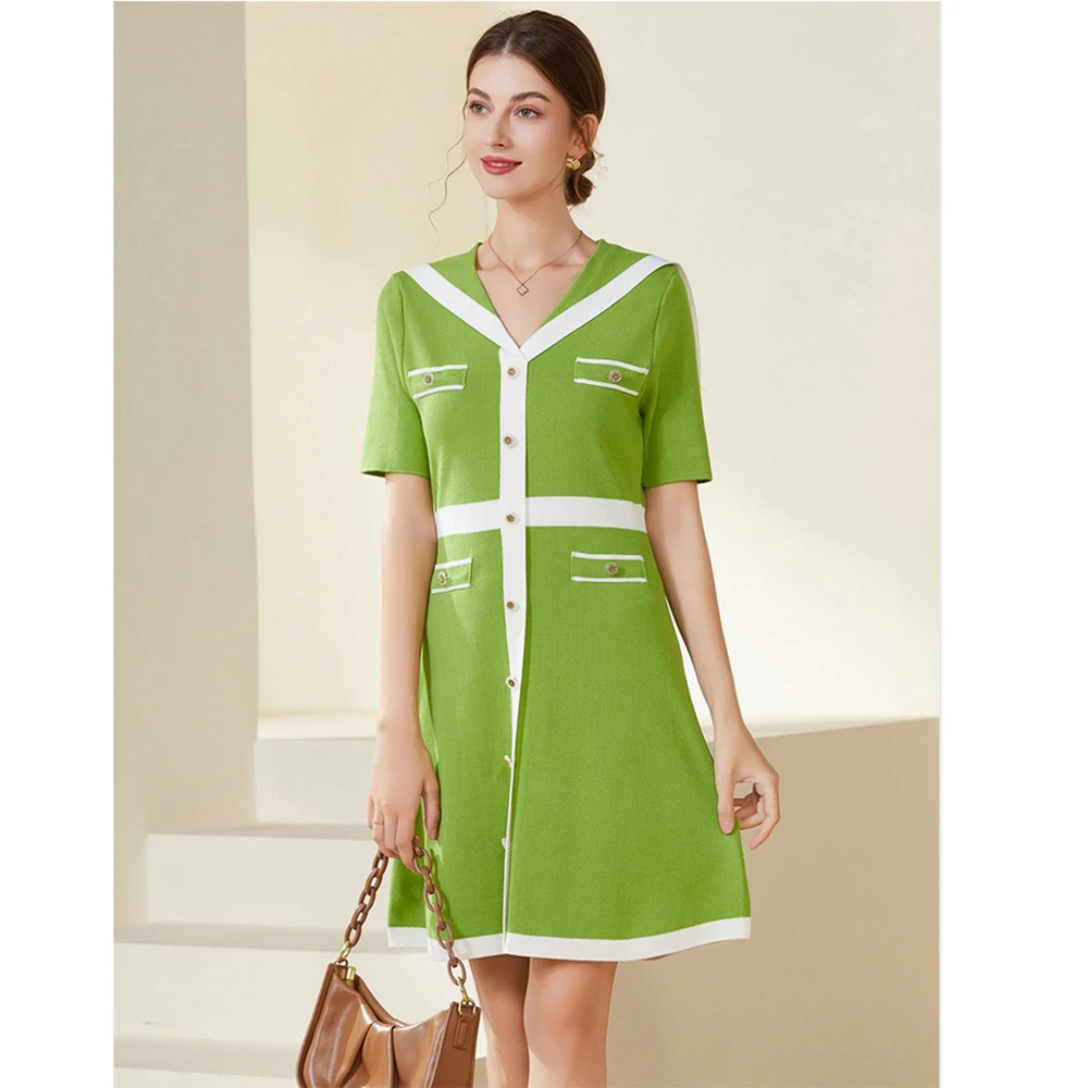 Summer Short Sleeve Ice Silk Knitted Dress Elegance Lapel Sailor Collar Women's A- Line Celebrity Knit Skirt Sweater