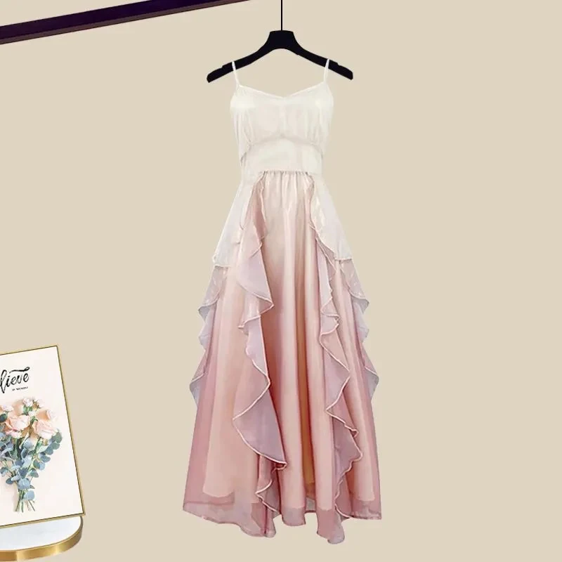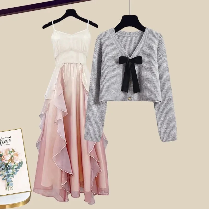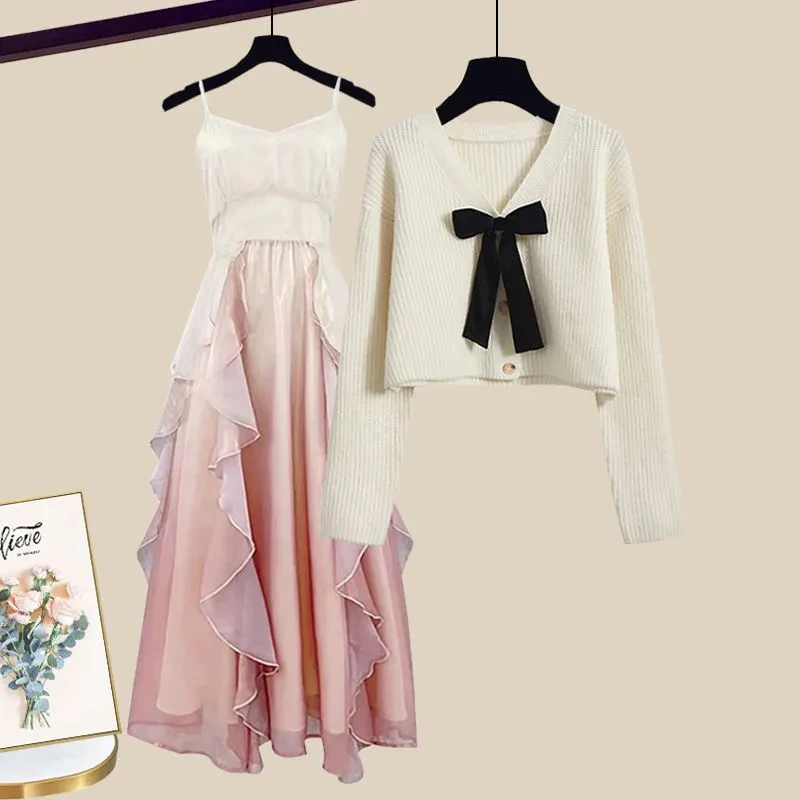 2024 Waist Slimming Suspender Skirt Two-piece Set Fashion Knitted Cardigan Slim Suspender Dress Two Piece Set for Women