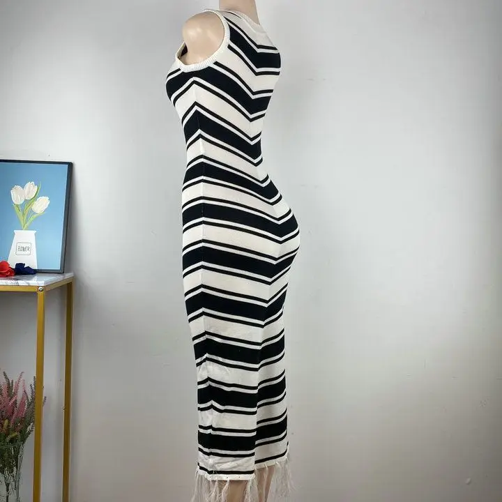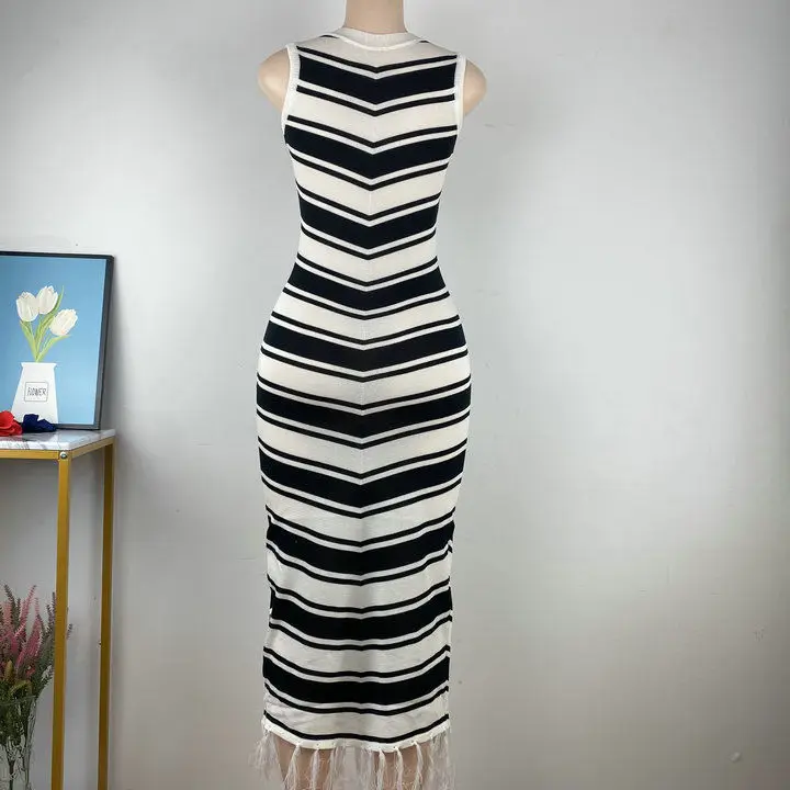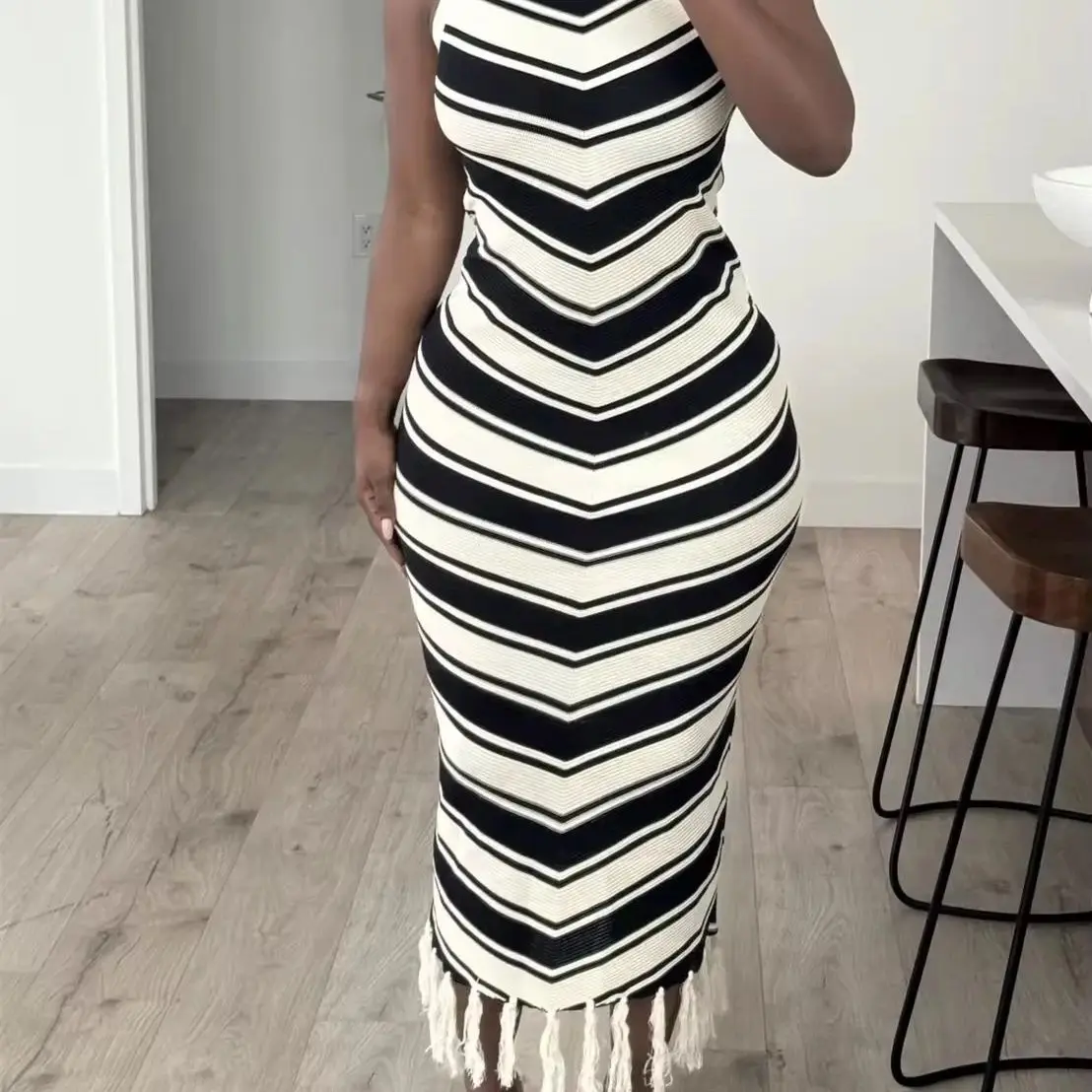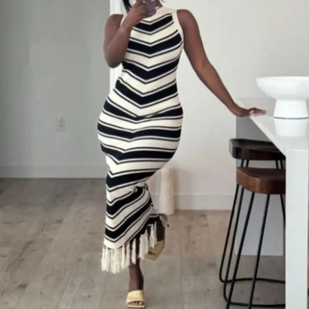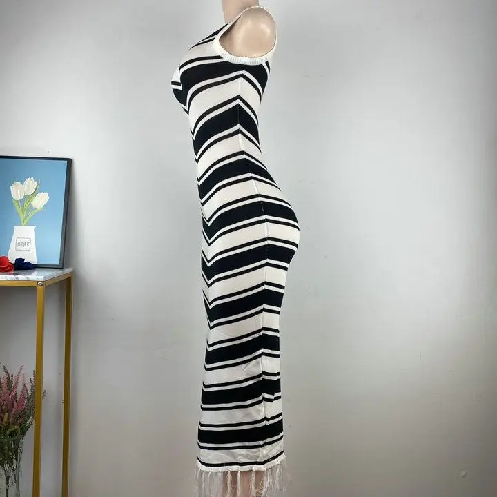 Casual Summer Striped Sexy Bodycon Dress Sleeveless Midi Knitted Sweater Long Tassel Skirt Fashionable Tight Fitting Long Skirt