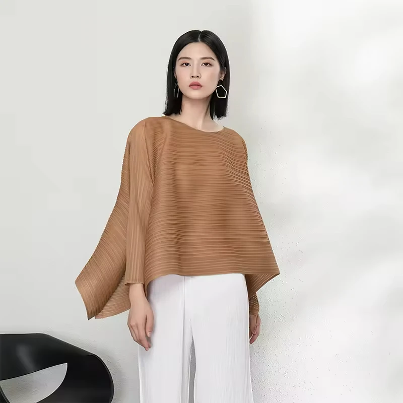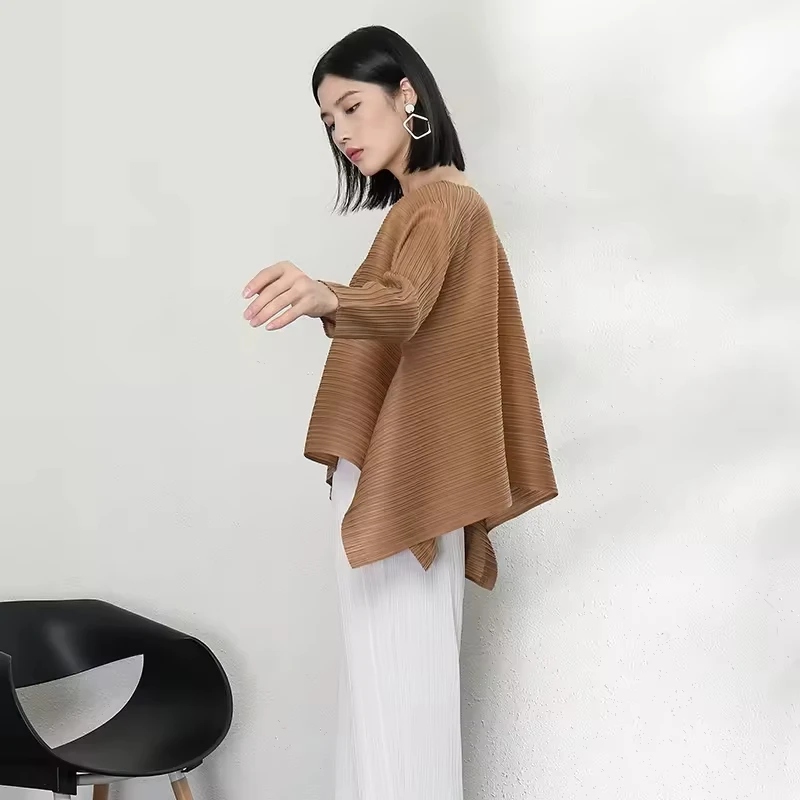 Miyake 2025 Women's Casual Long Sleeve Pleated T-Shirt Asymmetrical Solid Color Fashion Design Top