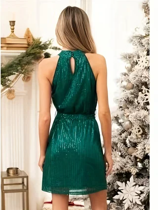 Elegant Ladies Dress Solid Flared Sleeveless Maxi Natural Waist Casual Square Collar Sequined for Spring Summer Winter Parties