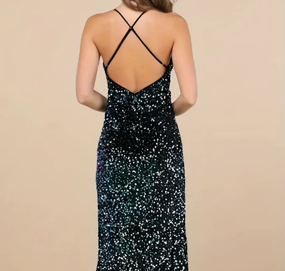 Elegant V-Neck Ladies Casual Formal Dresses Sexy Long Slit Sequins Shinny Straps ODM for Parties Weddings