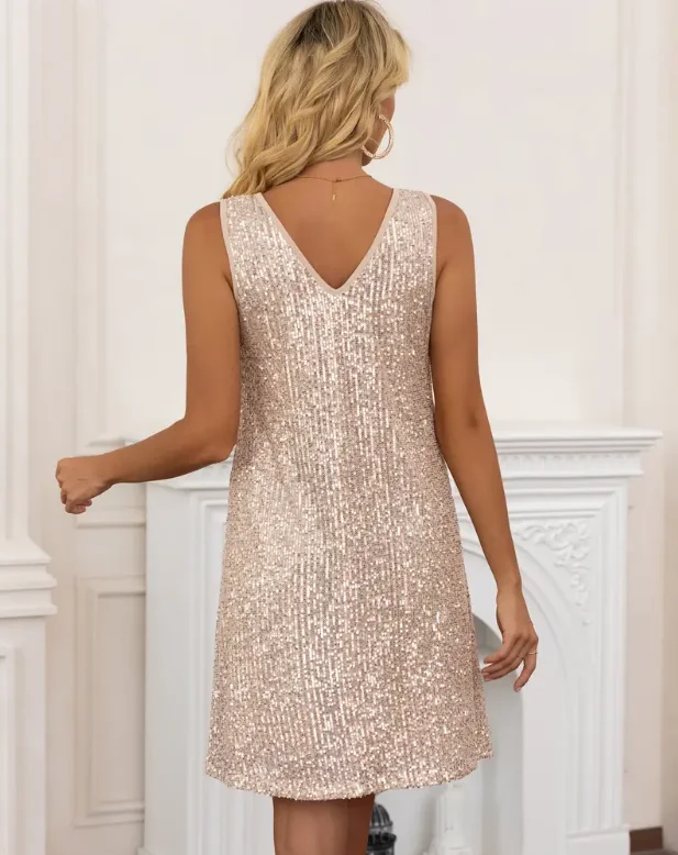 Women's V-neck Satin Dress With Sequins Ball Gown Style Loose Waistline Party-Ready Knee-Length Dress
