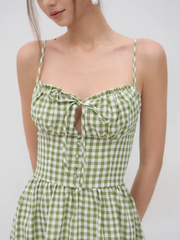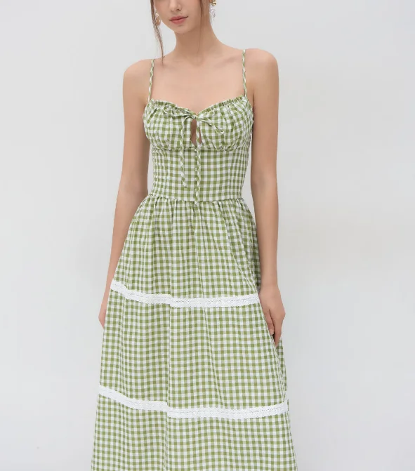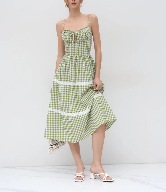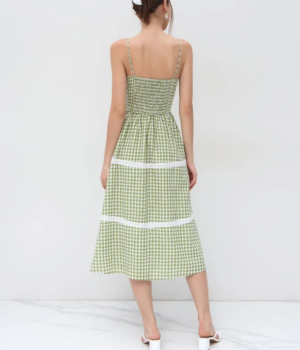 Green Midi Slip Dress for Ladies Spaghetti Strap Front Lace Casual Style Breathable Woven Summer Collarless