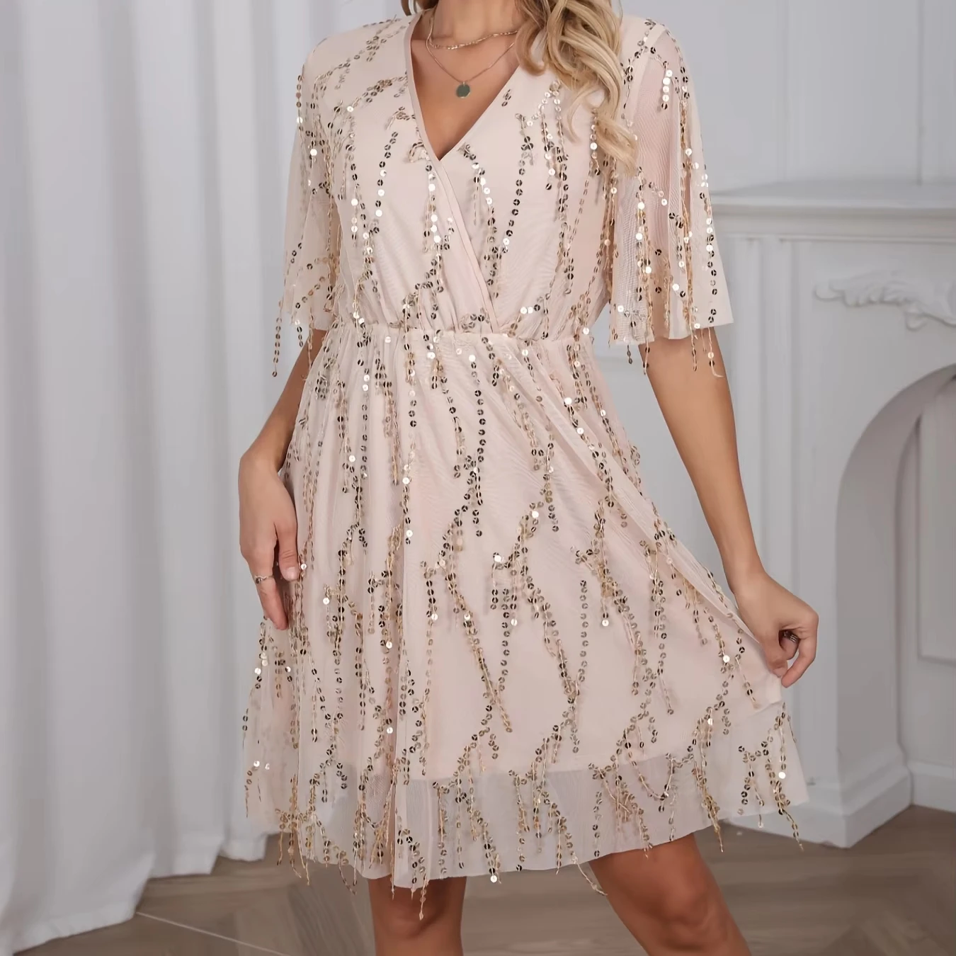 Women's Deep V-Neck A-Line Evening Dress Sequins Empire Waistline Woven Breathable Casual Solid Pattern Knee Length for Spring