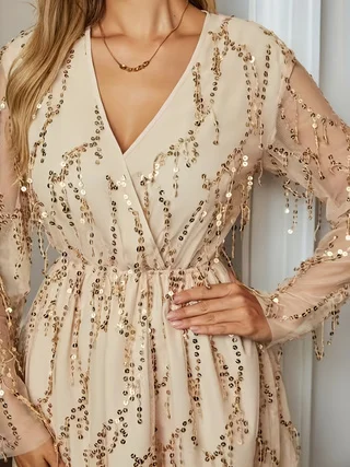 Trendy Women's A-Line Evening Dress Deep V-Neck Sequins Empire Waistline Woven Breathable Casual Solid Pattern Knee for Spring