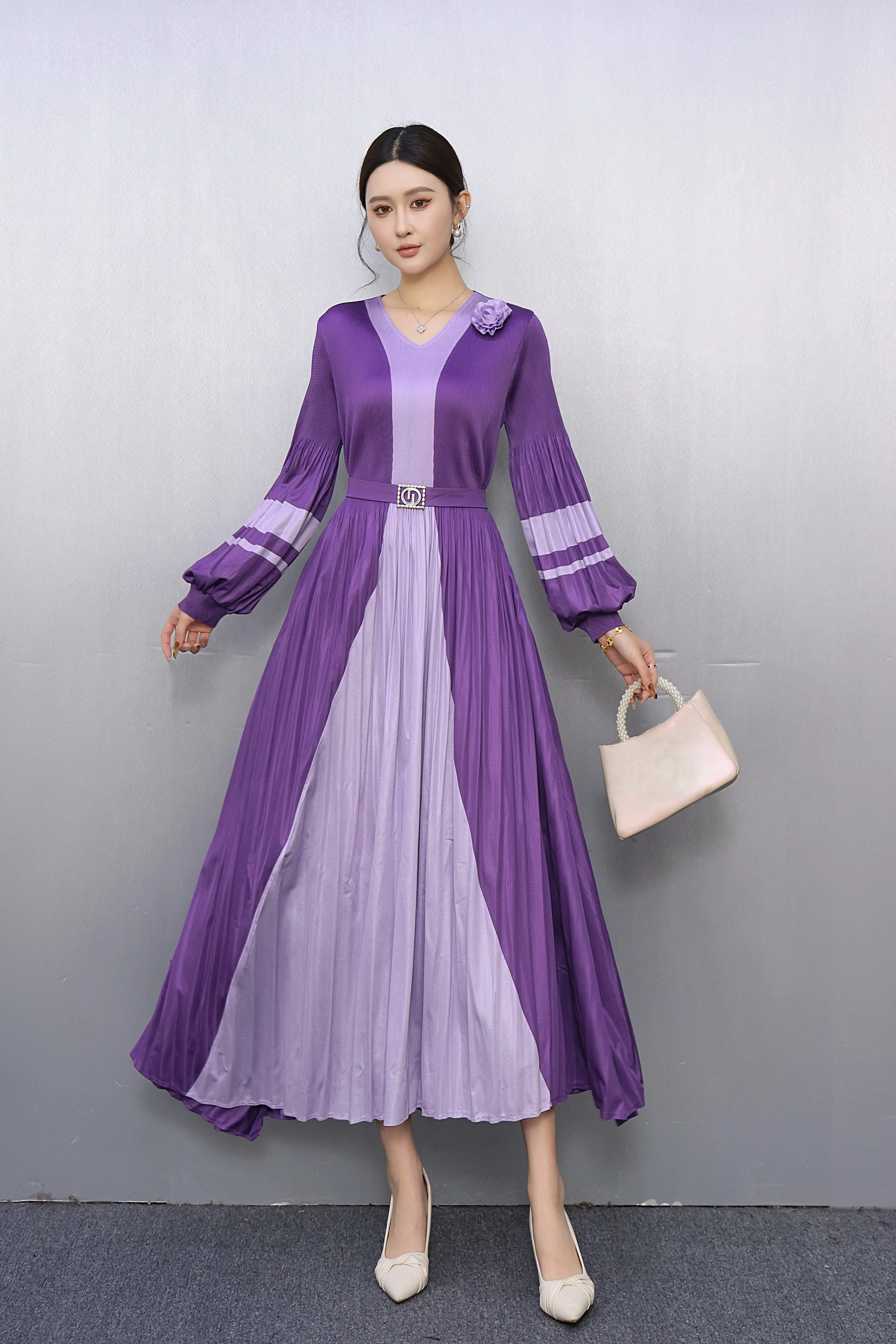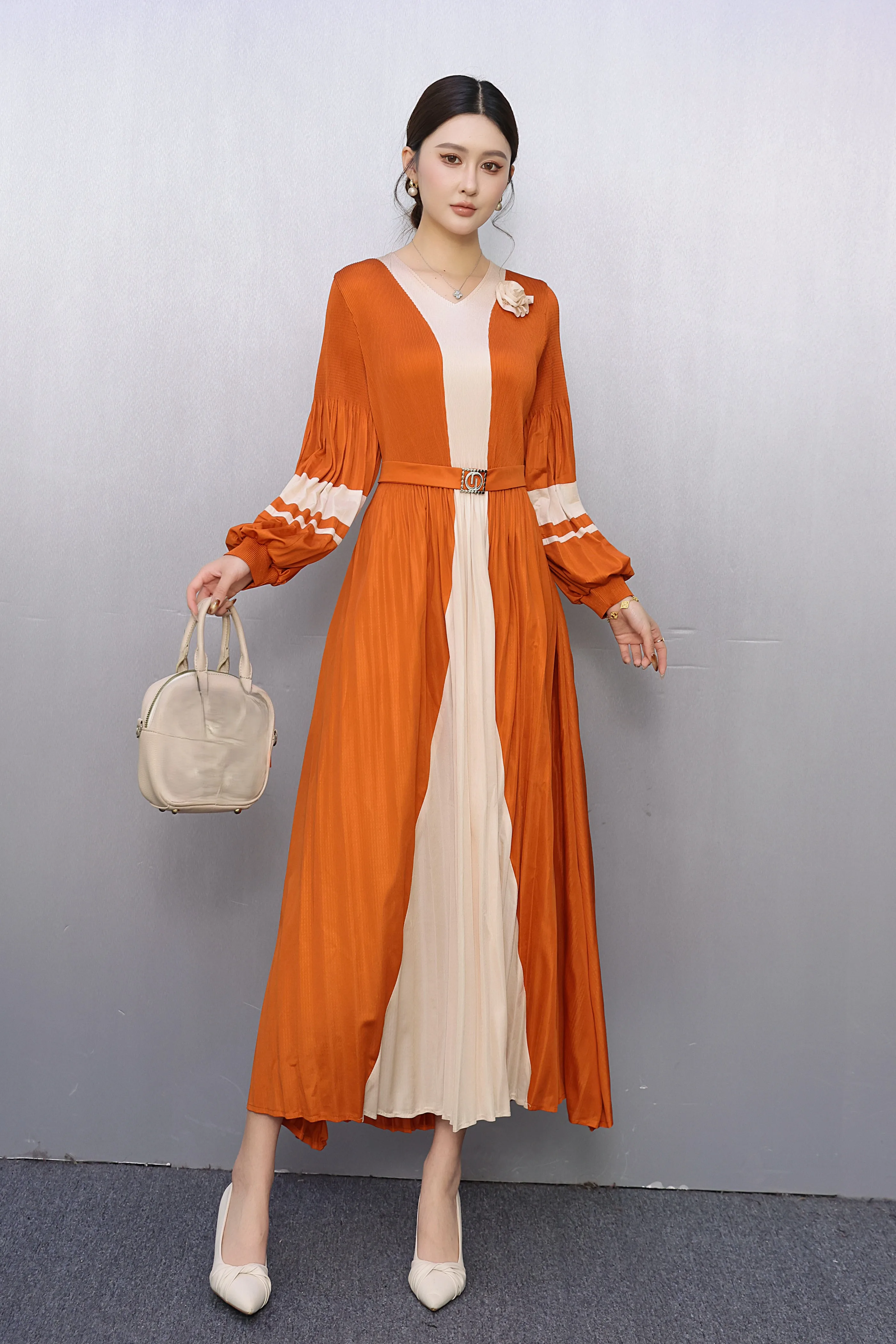 Women's Plus Size Yellow Black O-Neck Pleated Plain Dyed Maxi Dress Long Sleeve Belted Casual ODM