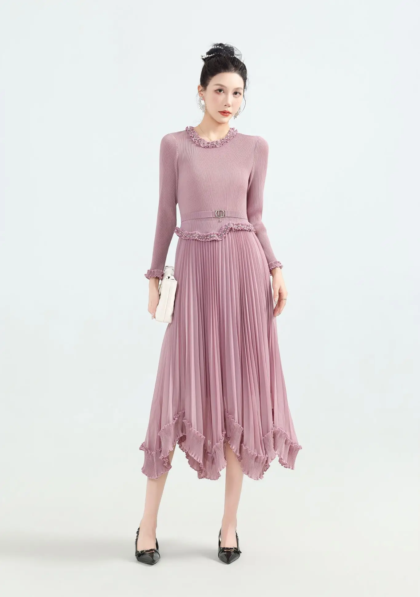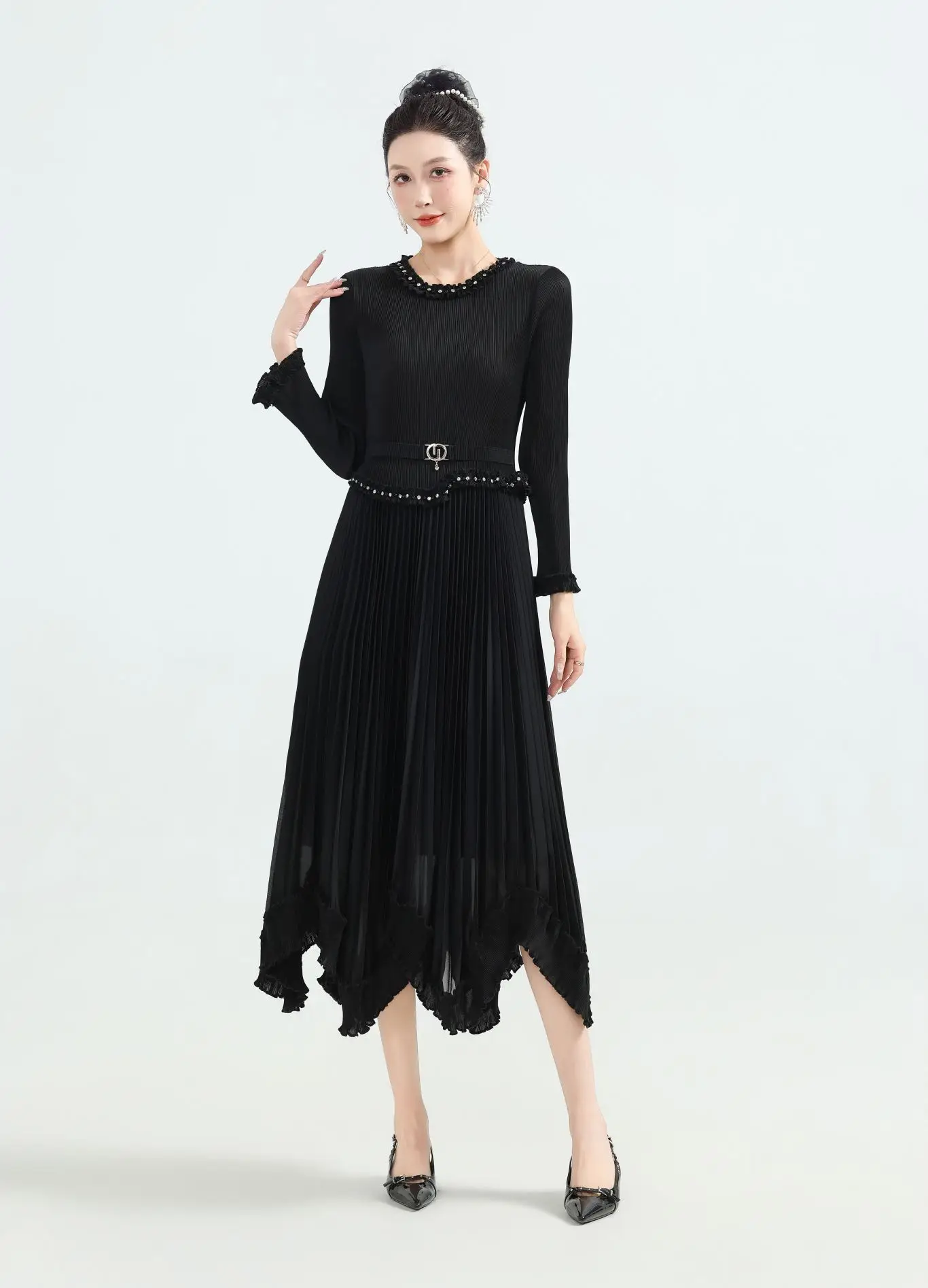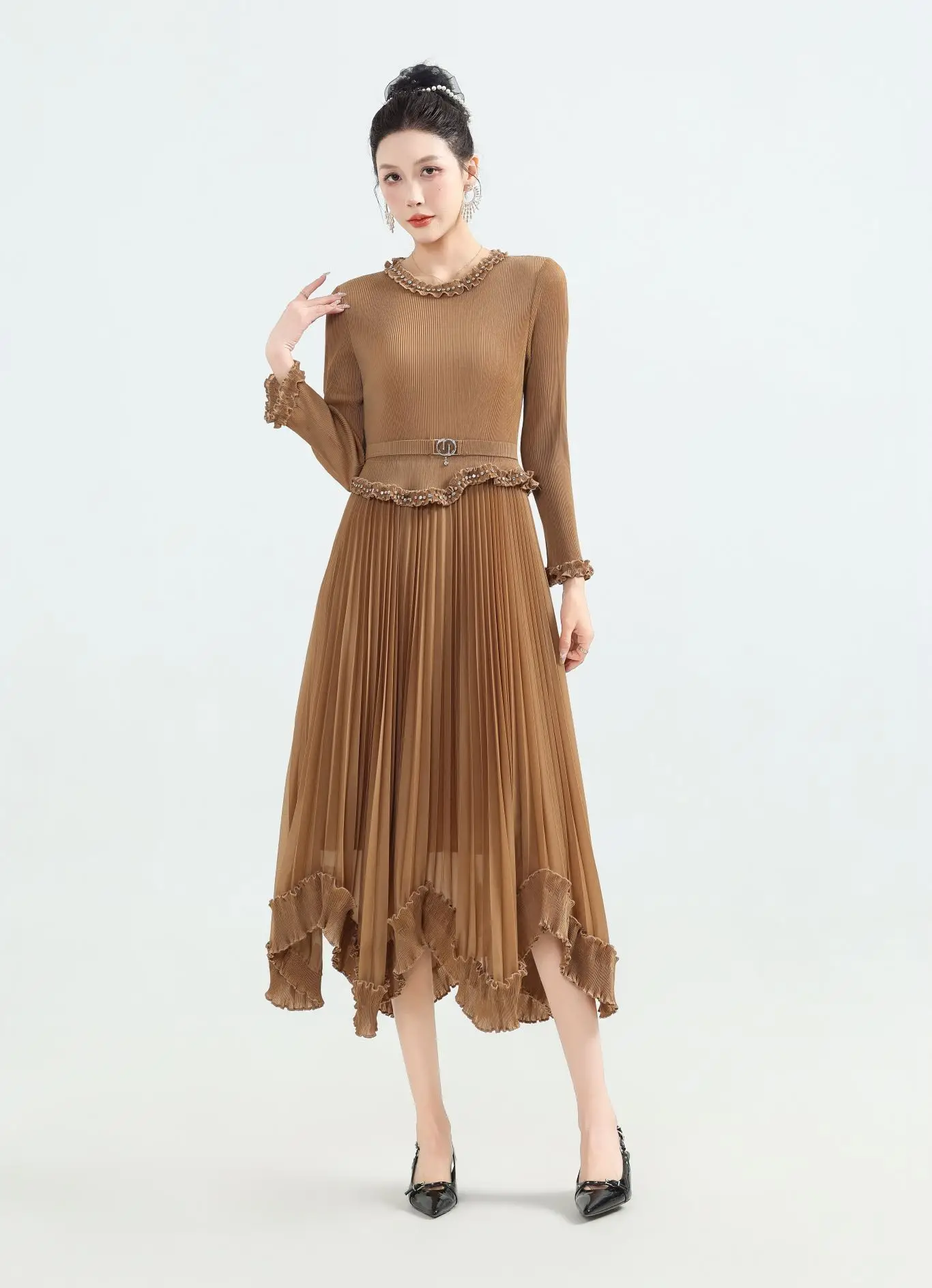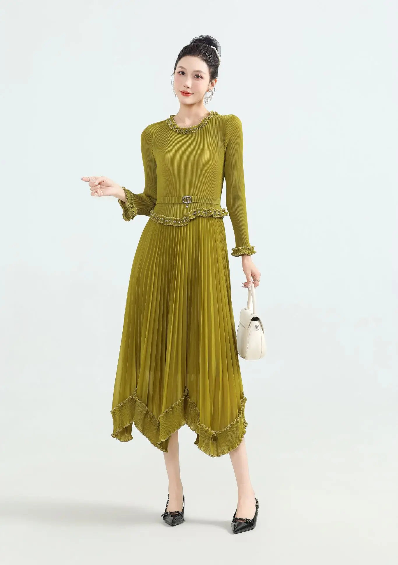 New Large-Sized Ruffled Decorative A-Line Midi Dress - a Pleated Waist-hugging Long-sleeved Dress Suitable for Women