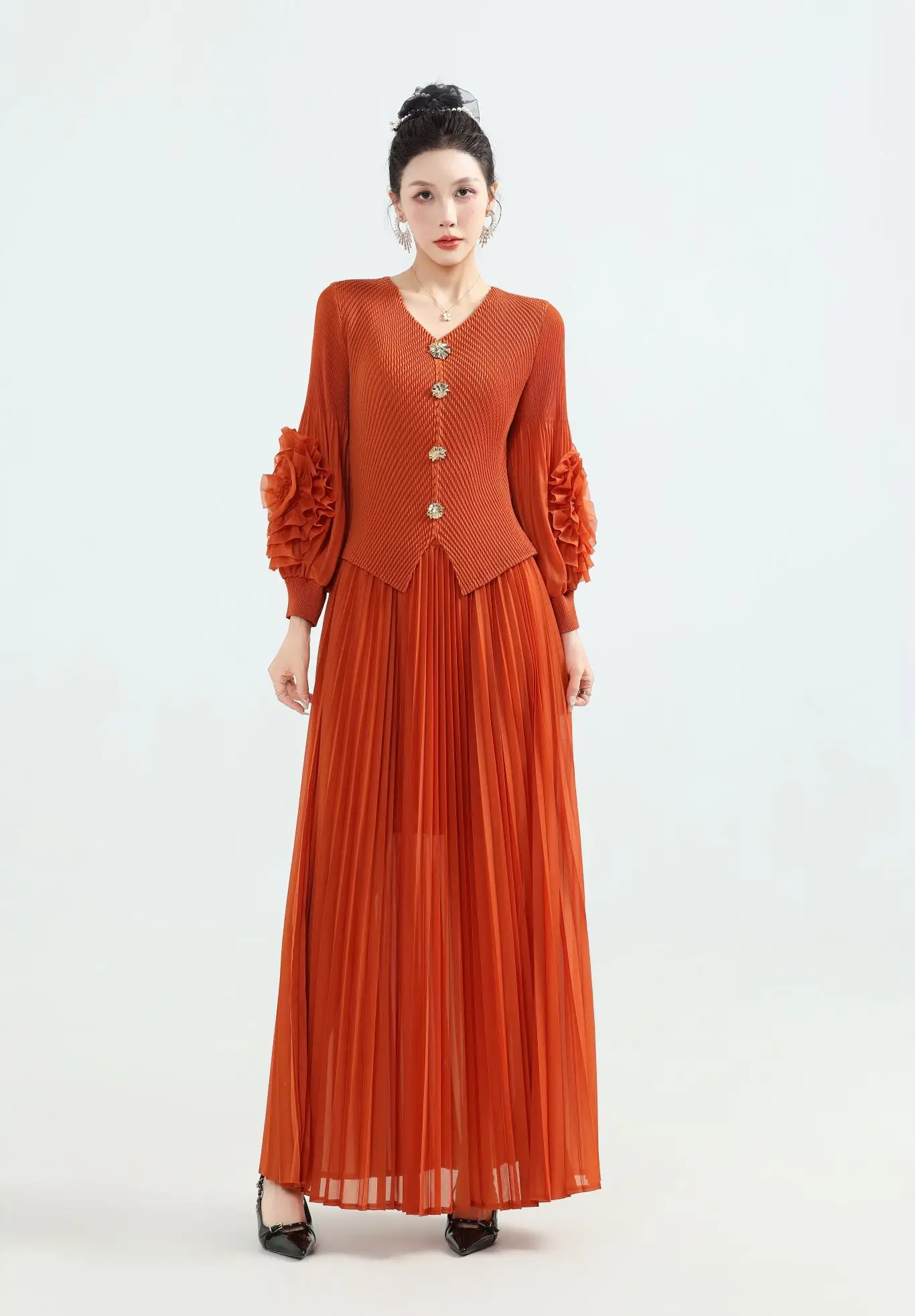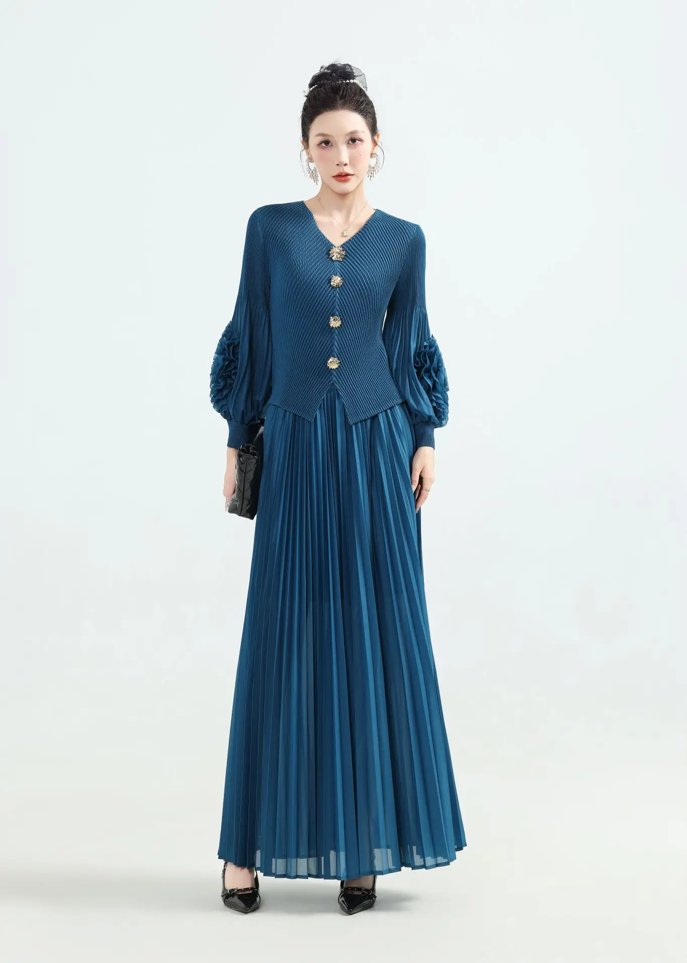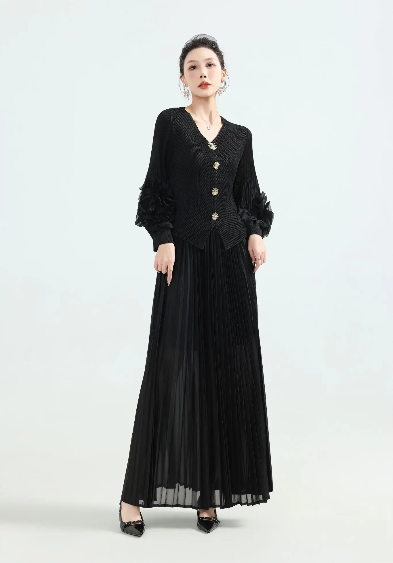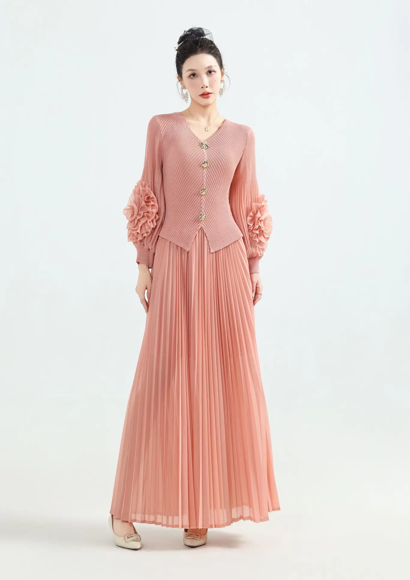 Solid-color Elegant Casual Pleated Dress with Petal Sleeves-Custom ODM Wholesale of Large-sized Dresses
