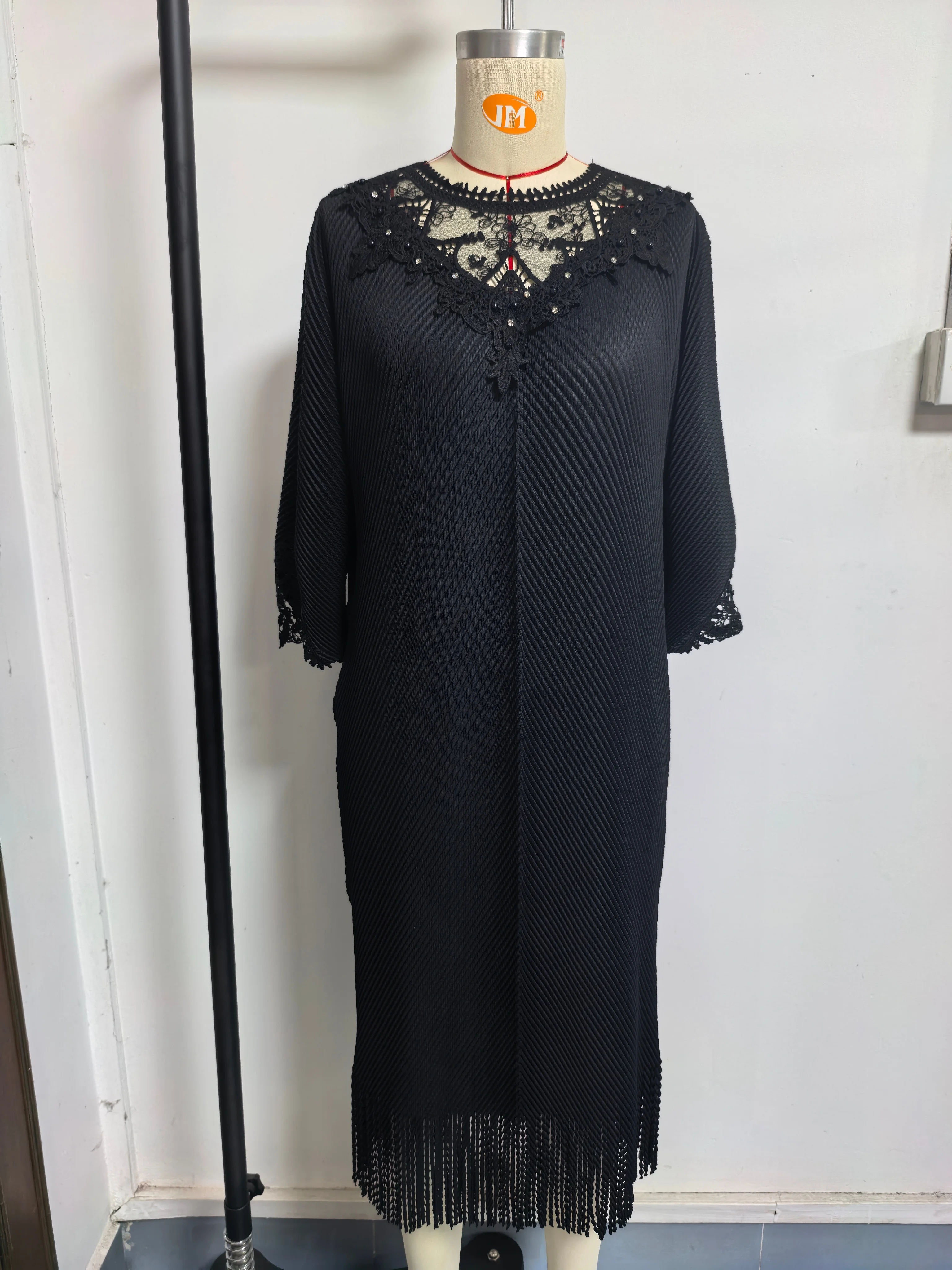 Lady's Large-sized Pleated Dress with Three-quarter Sleeves and Fringed Hem - Standard Size Dress