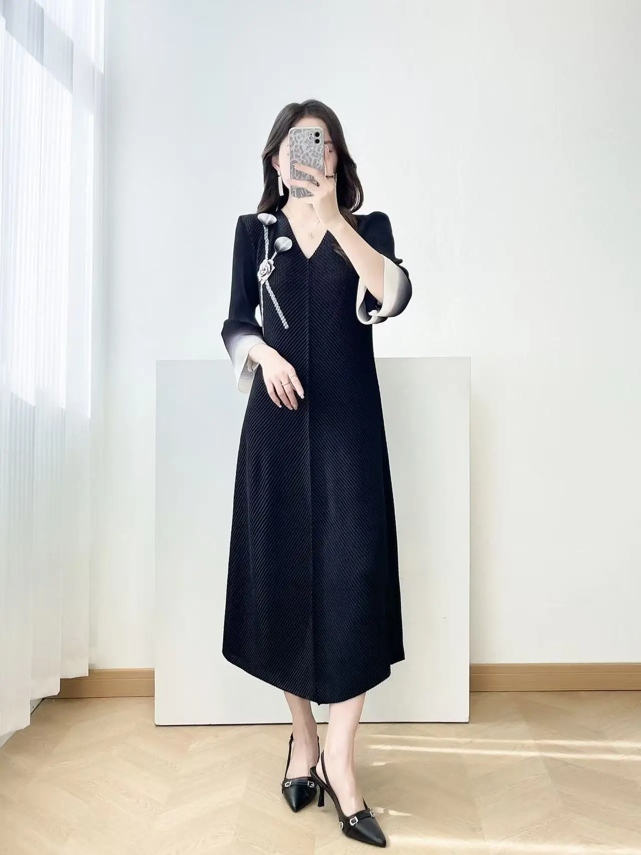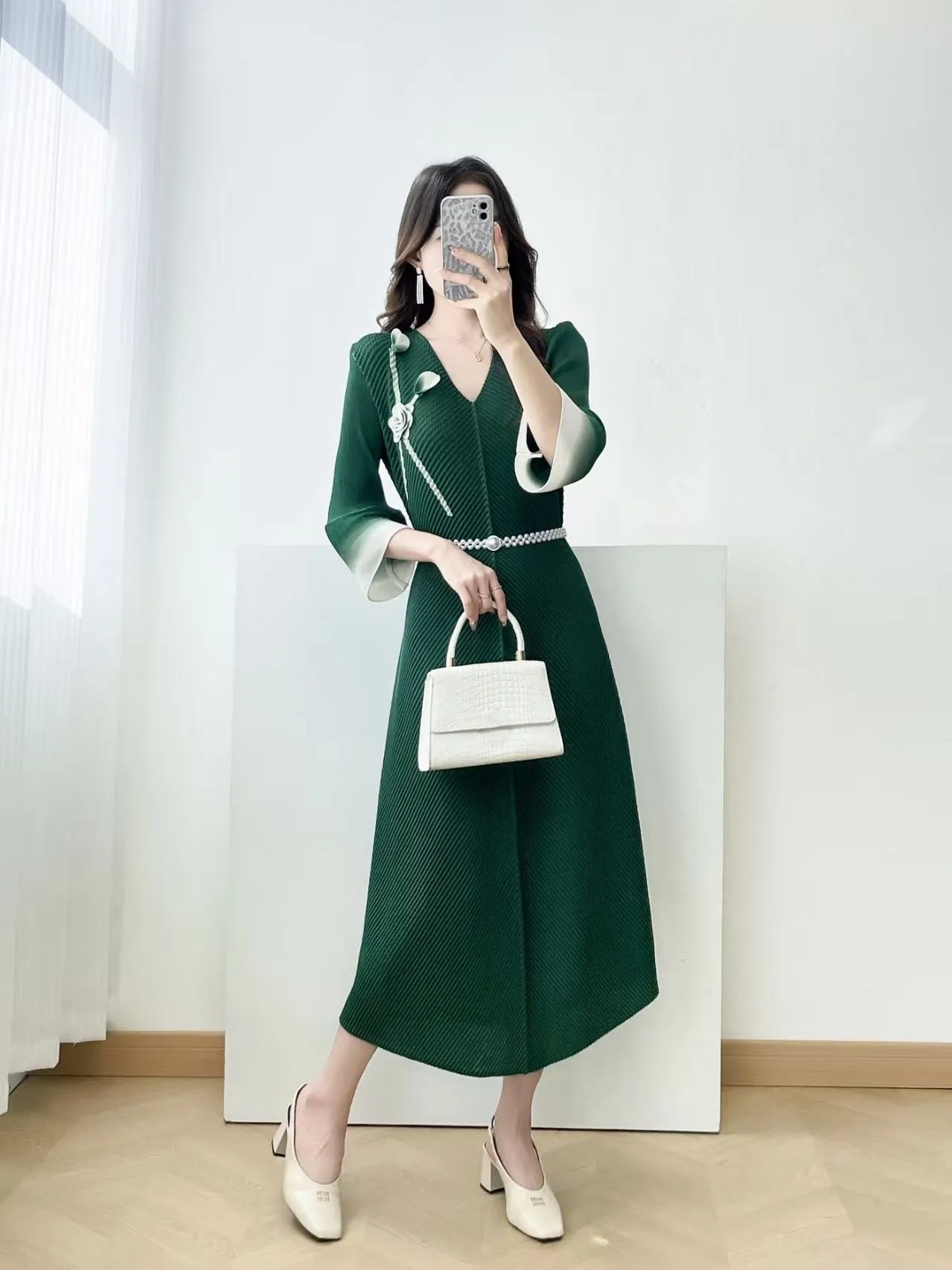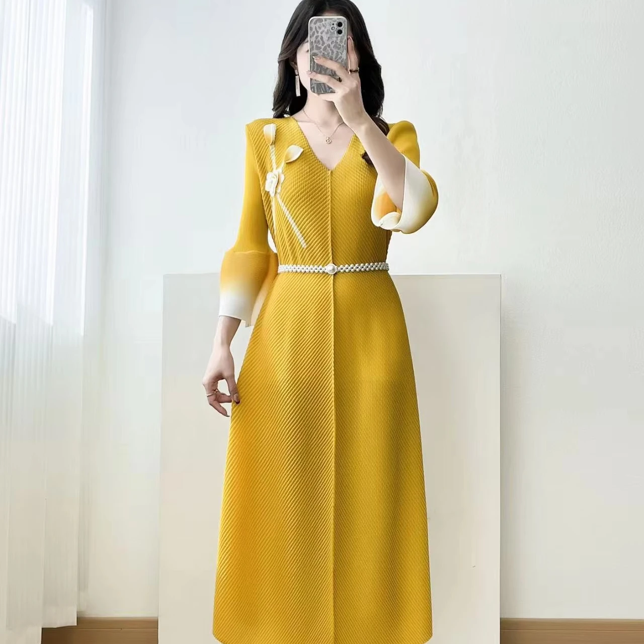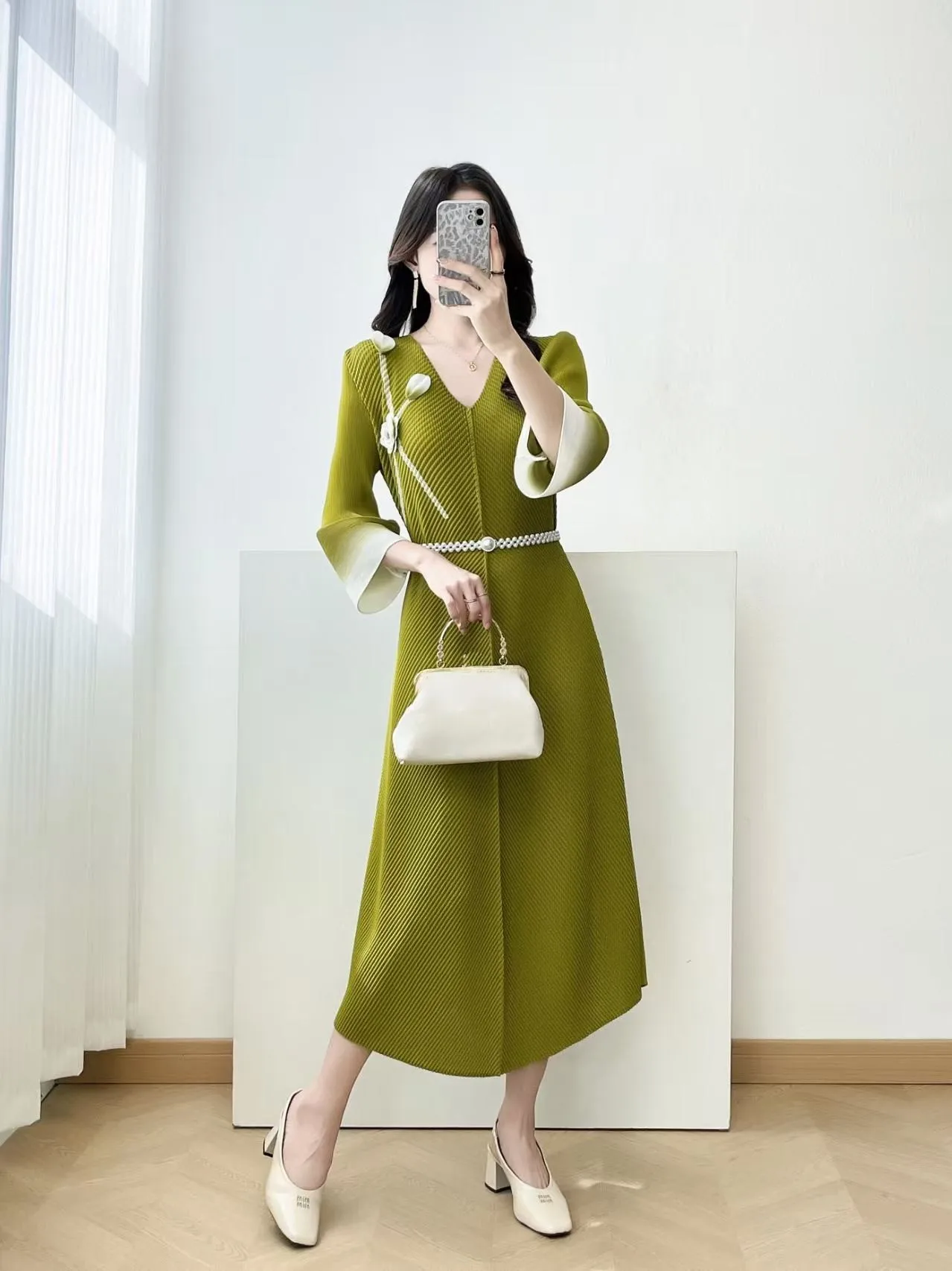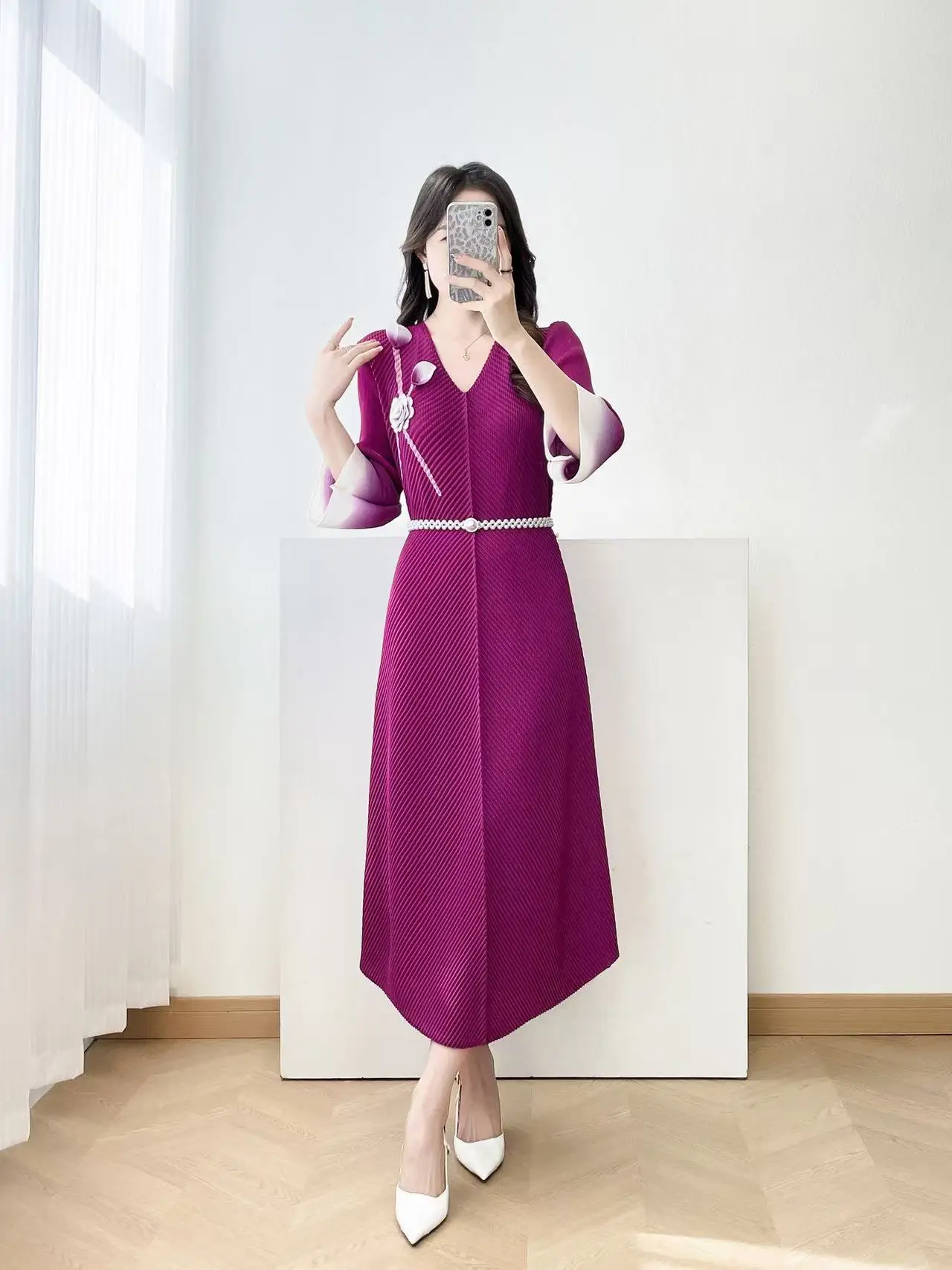 New High-quality Fish-scale Pleated Dress with an Elegant V-neck and Gradient Seven-inch Sleeves Featuring Honeycomb Pleats