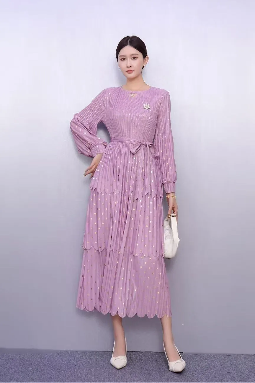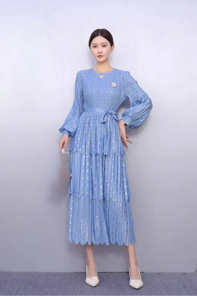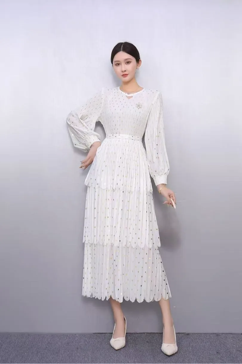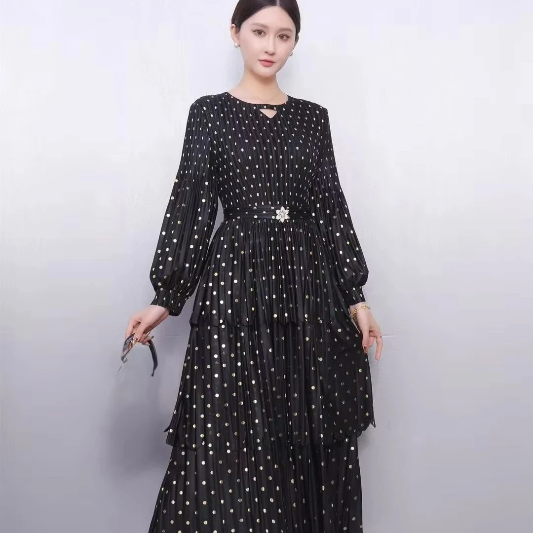 Women's Black Gold Polka Dot Pleated Dress Long Sleeve Tiered Midi Dress for Office