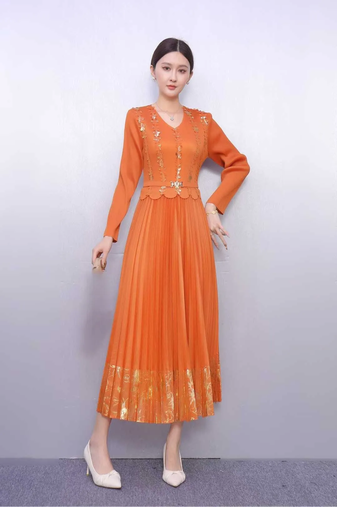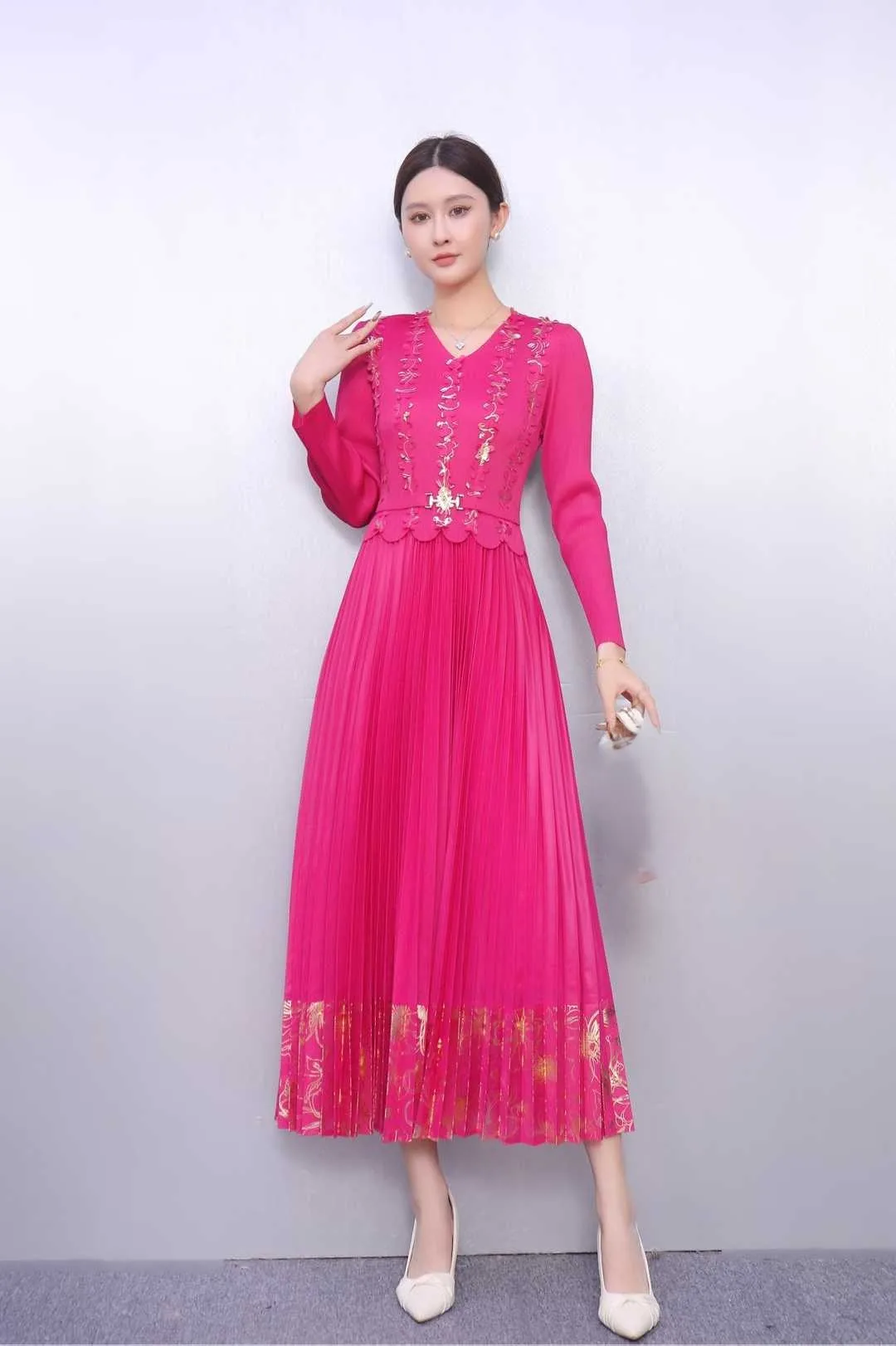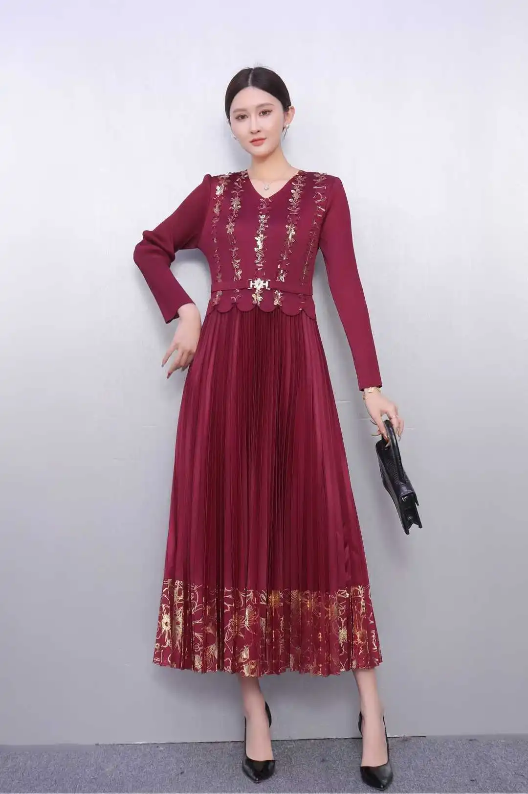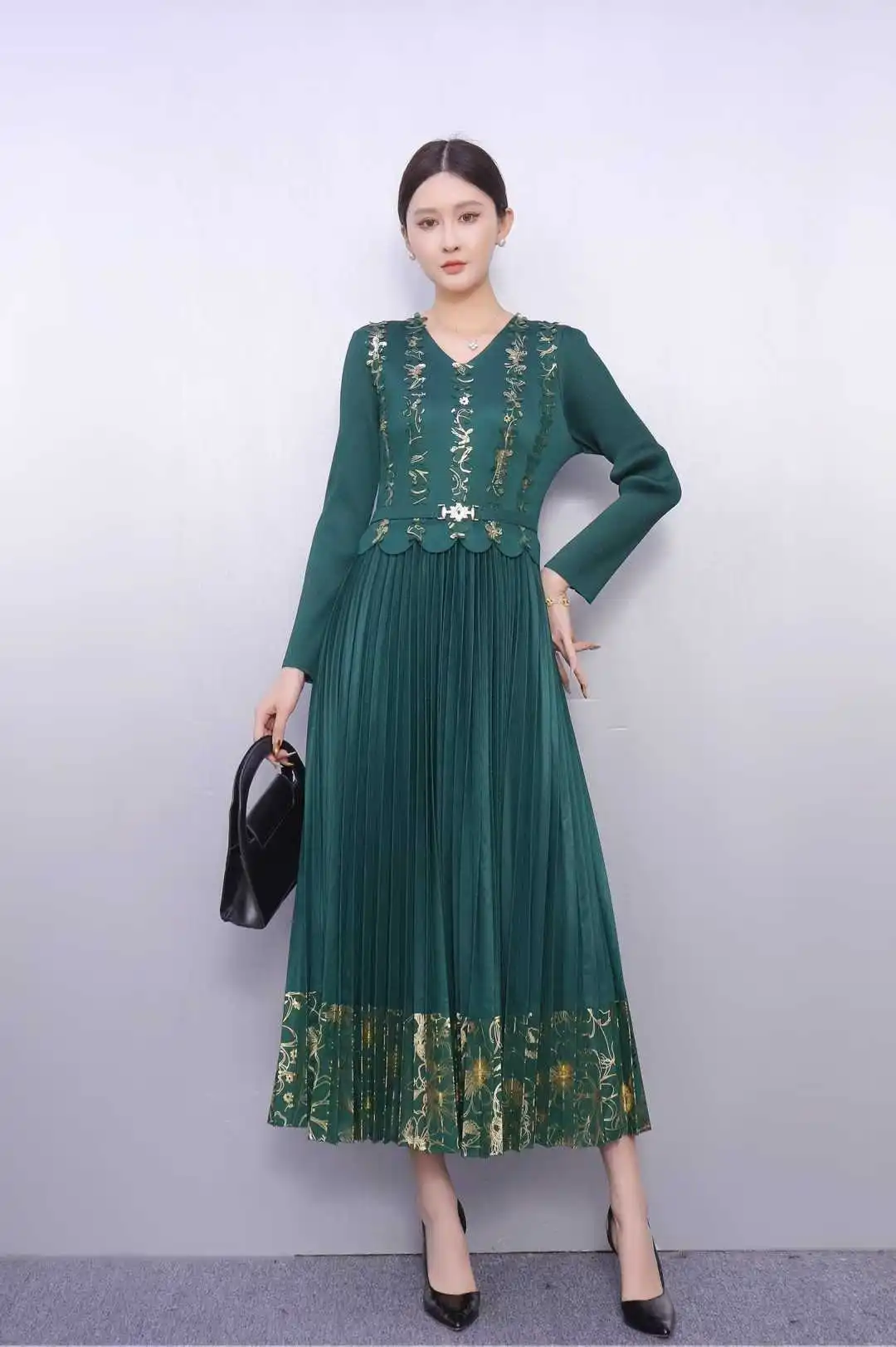 European and American Fashion Plus Size Casual Ladies' Floor-Length Pleated Dresses-High-end and Elegant Polyester
