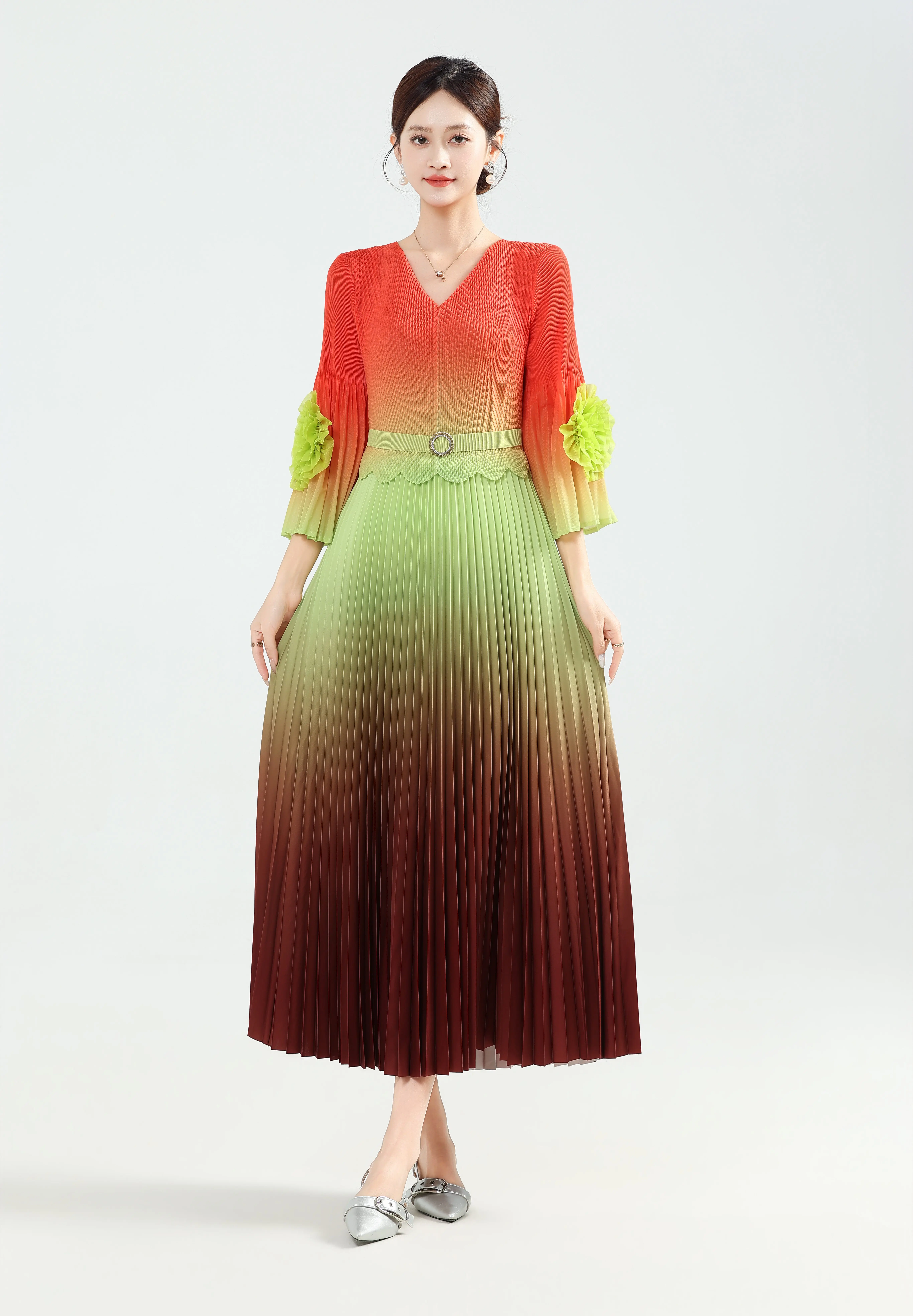 Miyake Pleated Dress with One-shoulder Design and Elegant V-neck with a Gradually Widening Size Range
